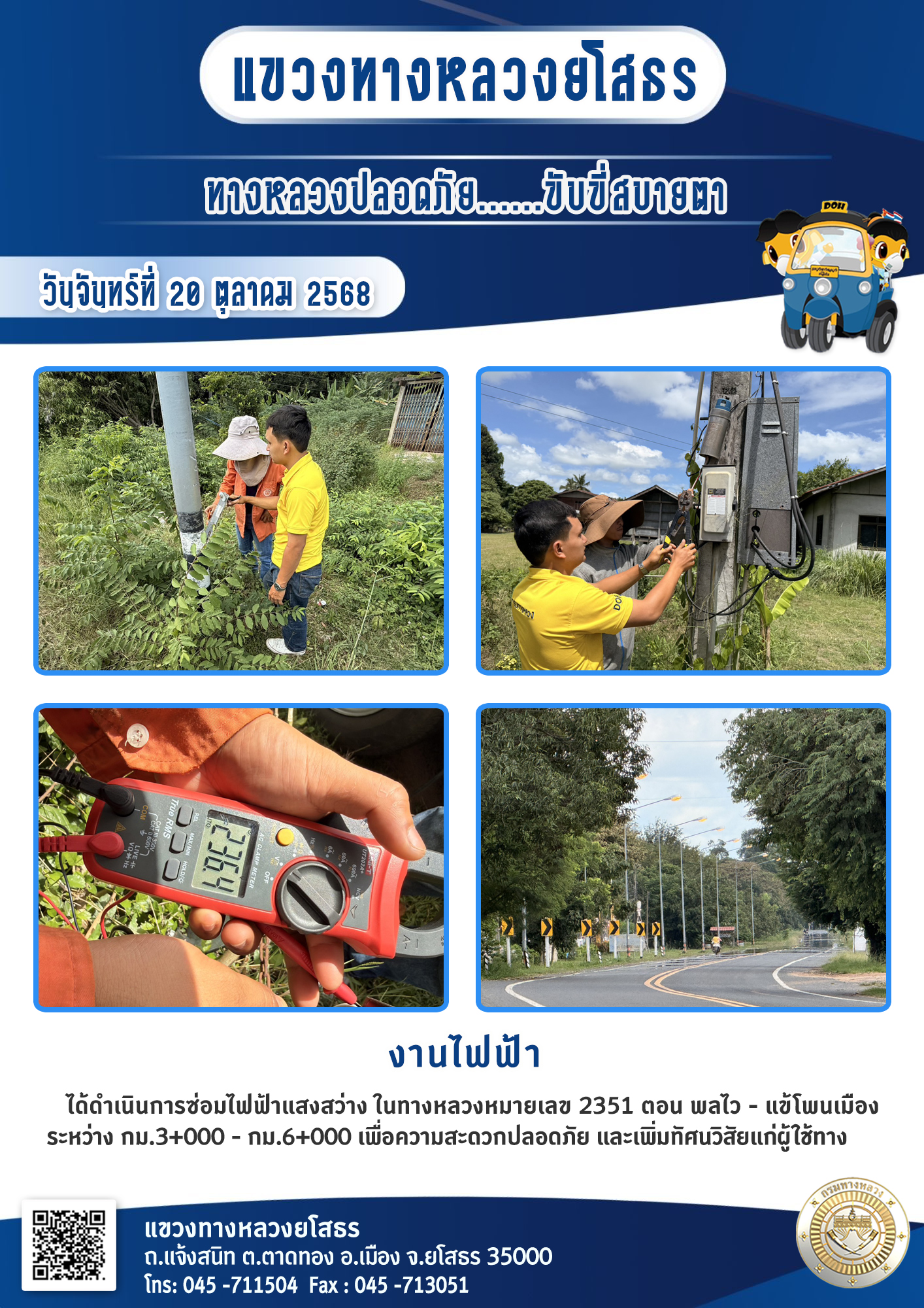 วันจันทร์ที่ 20 ตุลาคม 2568 งานไฟฟ้า ได้ดำเนินการซ่อมไฟฟ้าแสงสว่าง ในทางหลวงหมายเลข 2351 ตอน พลไว - แข้โพนเมือง ระหว่าง กม.3+000 - กม.6+000 เพื่อความสะดวกปลอดภัย และเพิ่มทัศนวิสัยแก่ผู้ใช้ทาง