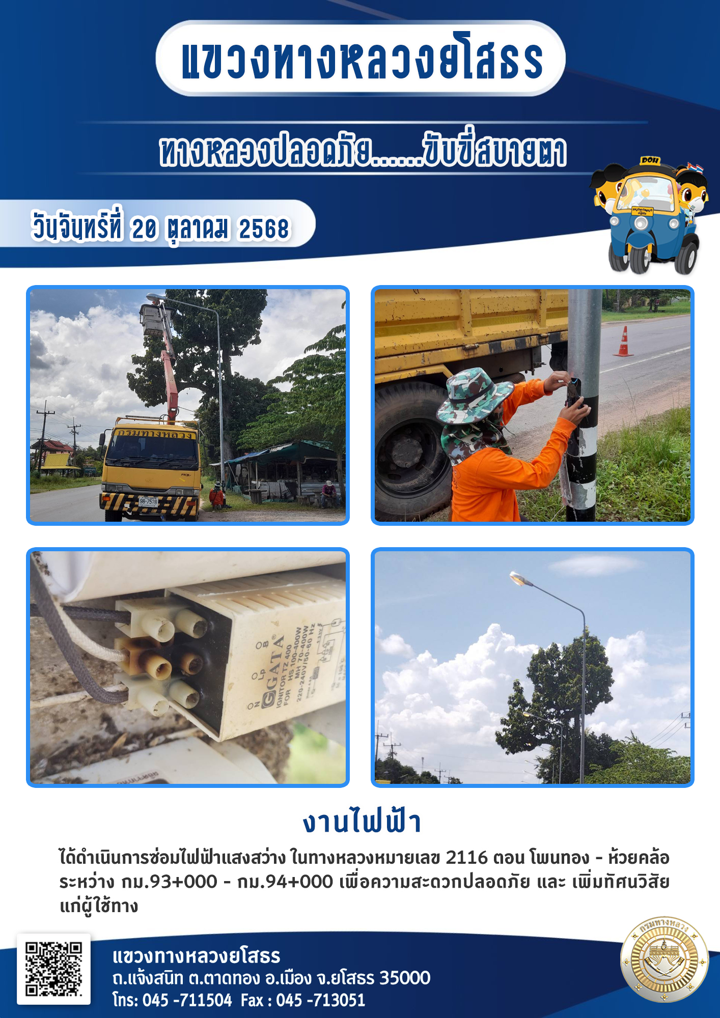 วันจันทร์ที่ 20 ตุลาคม 2568 งานไฟฟ้า ได้ดำเนินการซ่อมไฟฟ้าแสงสว่าง ในทางหลวงหมายเลข 2116 ตอน โพนทอง - ห้วยคล้อ ระหว่าง กม.93+000 - กม.94+000 เพื่อความสะดวกปลอดภัย และเพิ่มทัศนวิสัย แก่ผู้ใช้ทาง