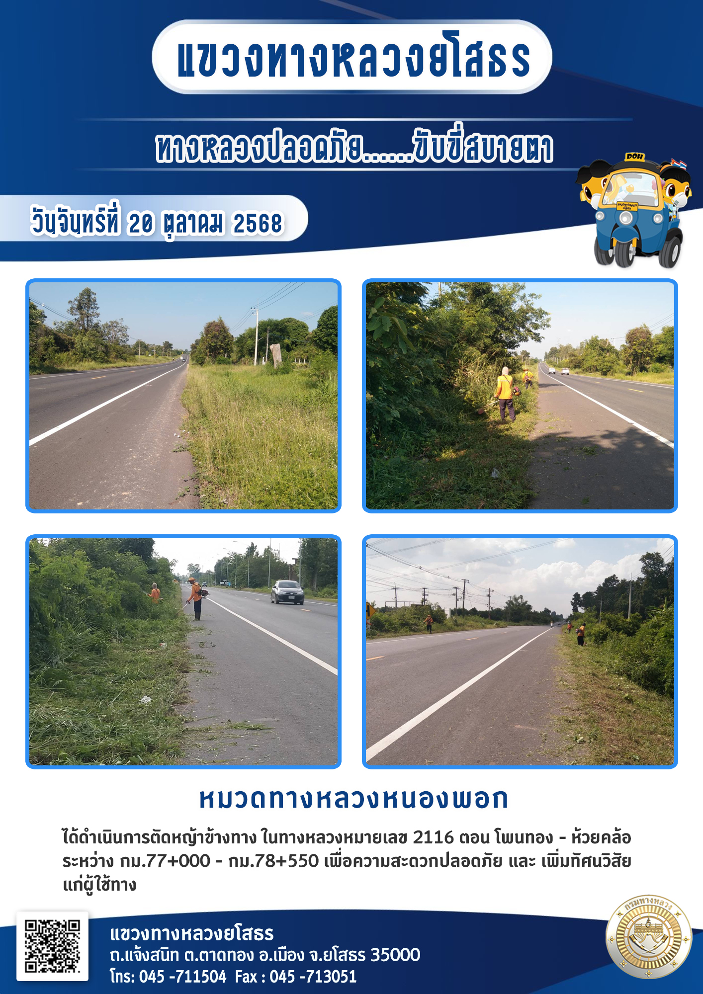 วันจันทร์ที่ 20 ตุลาคม 2568 หมวดทางหลวงหนองพอก ได้ดำเนินการตัดหญ้าข้างทาง ในทางหลวงหมายเลข 2116 ตอน โพนทอง - ห้วยคล้อ ระหว่าง กม.77+000 - กม.78+550 เพื่อความสะดวกปลอดภัย และเพิ่มทัศนวิสัย แก่ผู้ใช้ทาง