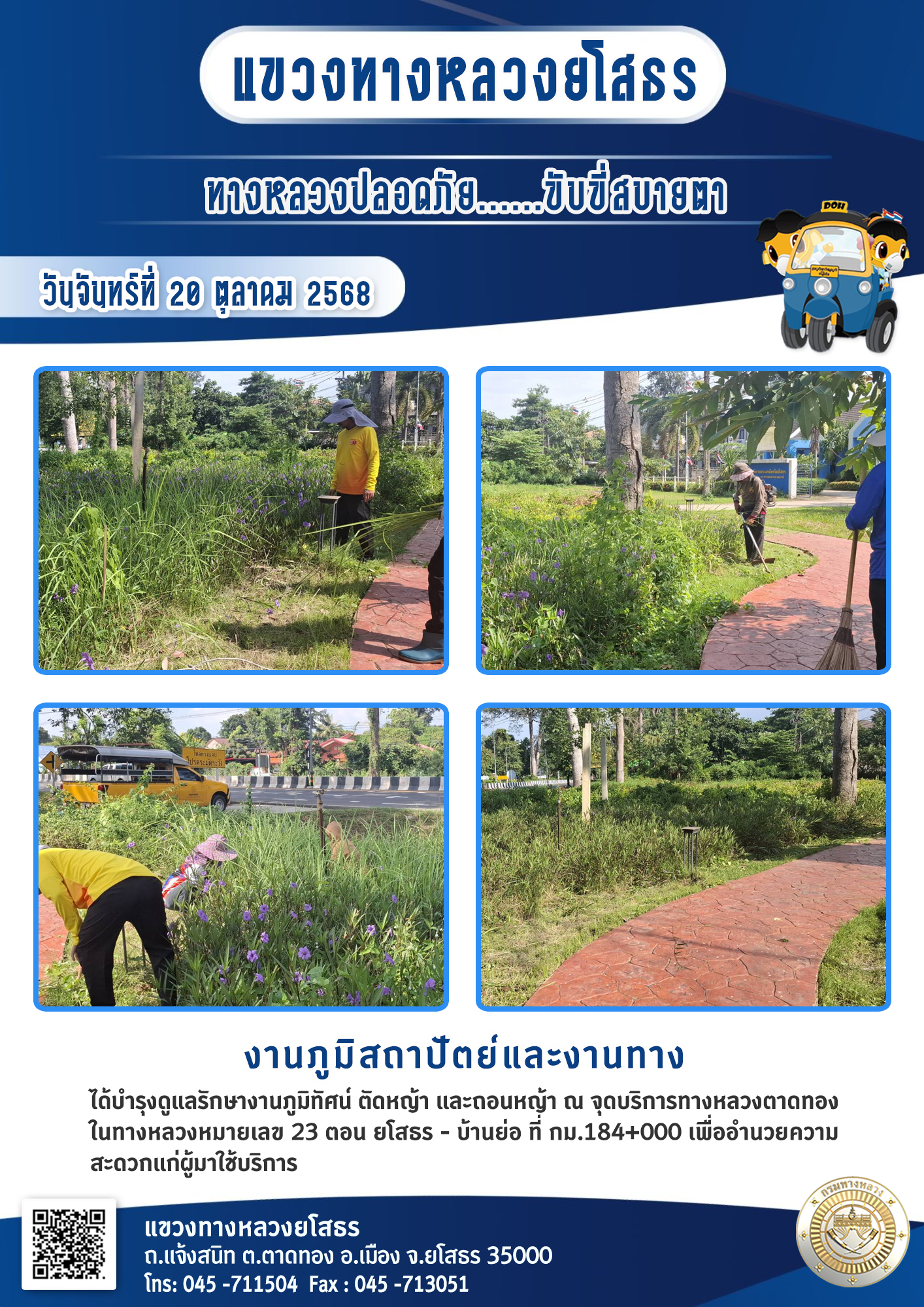 วันจันทร์ที่ 20 ตุลาคม 2568 งานภูมิสถาปัตย์และงานทาง ได้บำรุงดูแลรักษางานภูมิทัศน์ ตัดหญ้า และถอนหญ้า ณ จุดบริการทางหลวงตาดทอง ในทางหลวงหมายเลข 23 ตอน ยโสธร - บ้านย่อ ที่ กม.184+000 เพื่ออำนวยความสะดวกแก่ผู้มาใช้บริการ