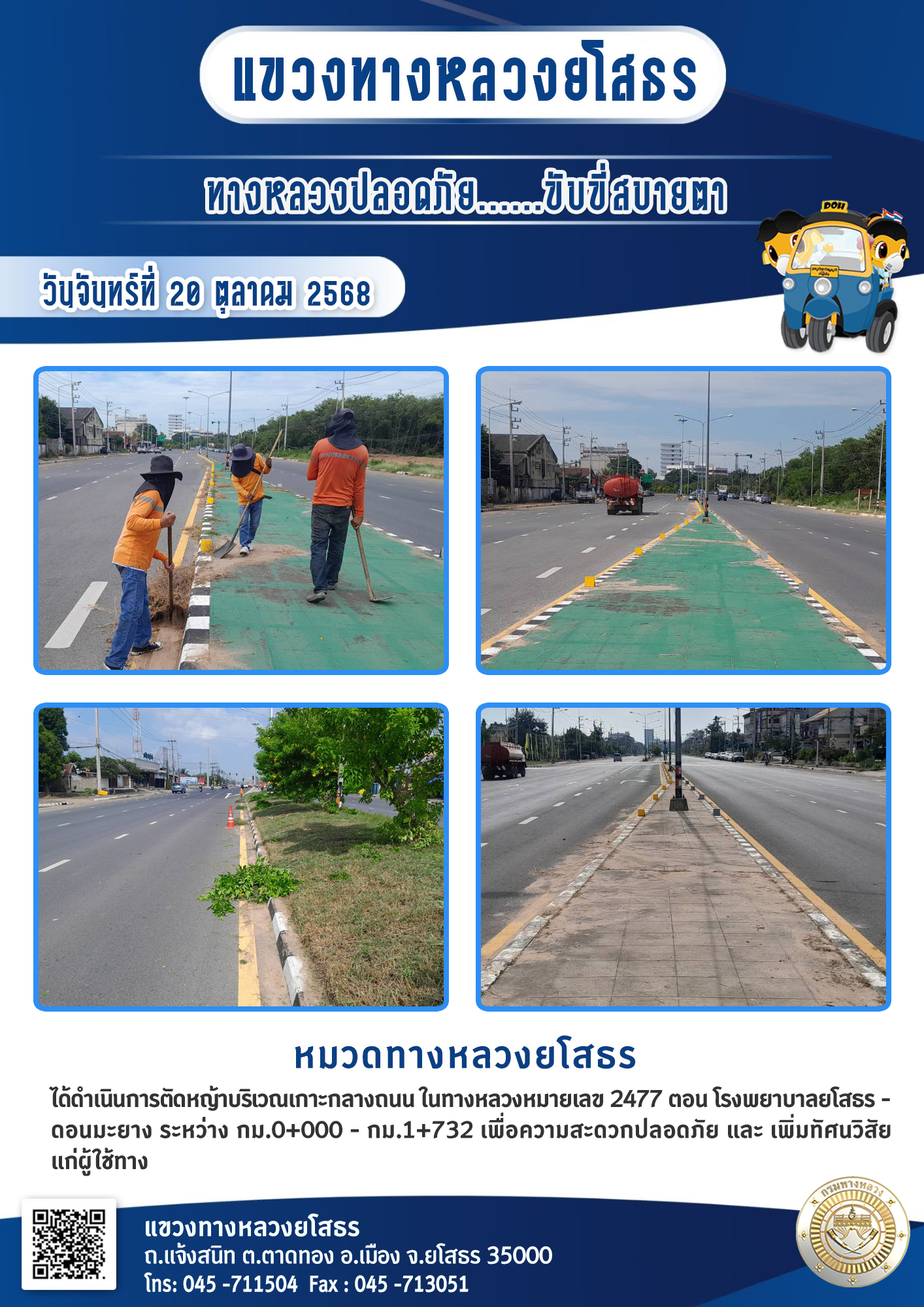 วันจันทร์ที่ 20 ตุลาคม 2568 หมวดทางหลวงยโสธร ได้ดำเนินการตัดหญ้าบริเวณเกาะกลางถนน ในทางหลวงหมายเลข 2477 ตอน โรงพยาบาลยโสรร - ดอนมะยาง ระหว่าง กม.0+000 - กม.1+732 เพื่อความสะดวกปลอดภัย และเพิ่มทัศนวิสัย แก่ผู้ใช้ทาง