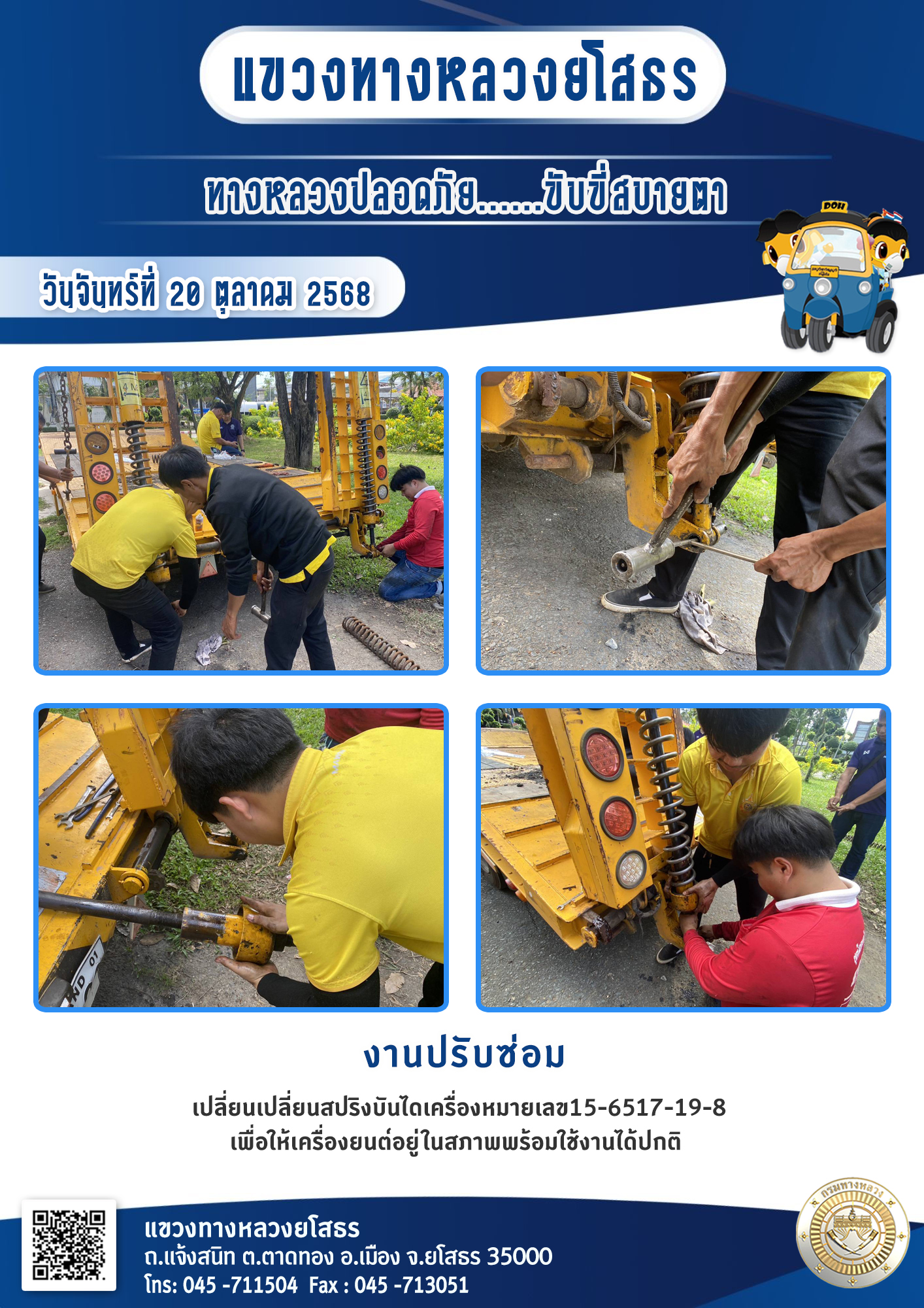 - [10:21] ทั่วไป วันอังคารที่ 31 มีนาคม 2569 งานอำนวยความปลอดภัย ได้ดำเนินการตัดหญ้า ทำความสะอาดภายในบริเวณแขวงทางหลวงยโสธร