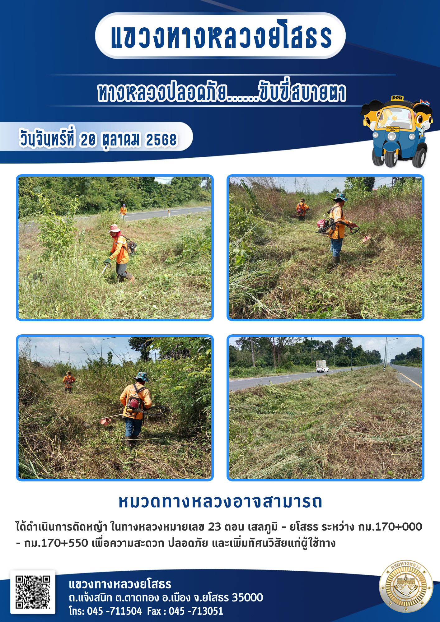 - [10:14] ทั่วไป วันอังคารที่ 31 มีนาคม 2569 หมวดทางหลวงคำเขื่อนแก้ว ได้ดำเนินการตัดหญ้าข้างทาง ในทางหลวงหมายเลข 23 ตอน บ้านย่อ - บ้านสวน ระหว่าง กม.204+000 - กม.205+000 เพื่อความสะดวก ปลอดภัย และเพิ่มทัศนวิสัยแก่ผู้ใช้ทาง