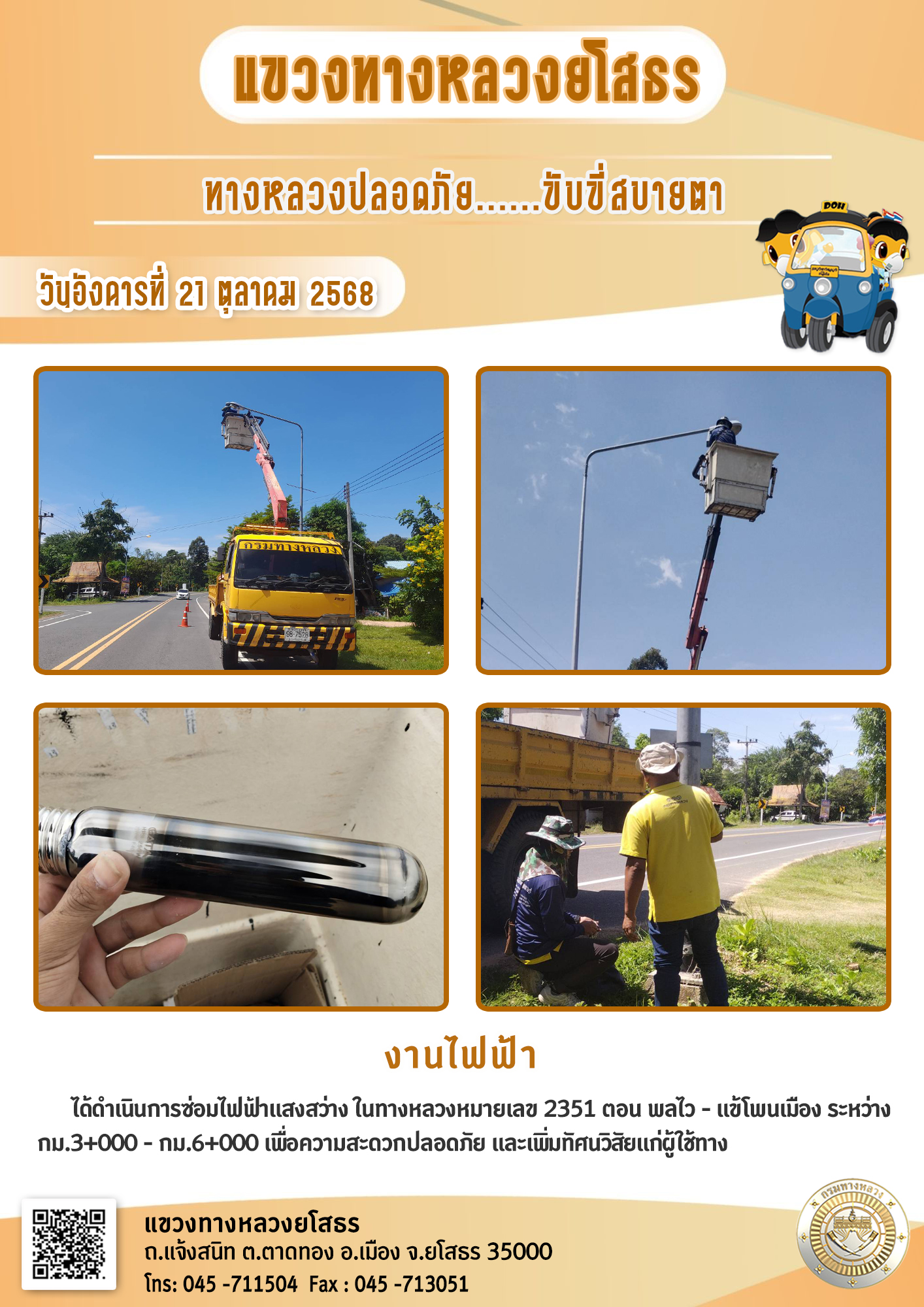 วันอังคารที่ 21 ตุลาคม 2568 งานไฟฟ้า ได้ดำเนินการซ่อมไฟฟ้าแสงสว่าง ในทางหลวงหมายเลข 2351 ตอน พลไว - แข้โพนเมือง ระหว่าง กม.3+000 - กม.6+000 เพื่อความสะดวกปลอดภัย และเพิ่มทัศนวิสัยแก่ผู้ใช้ทาง