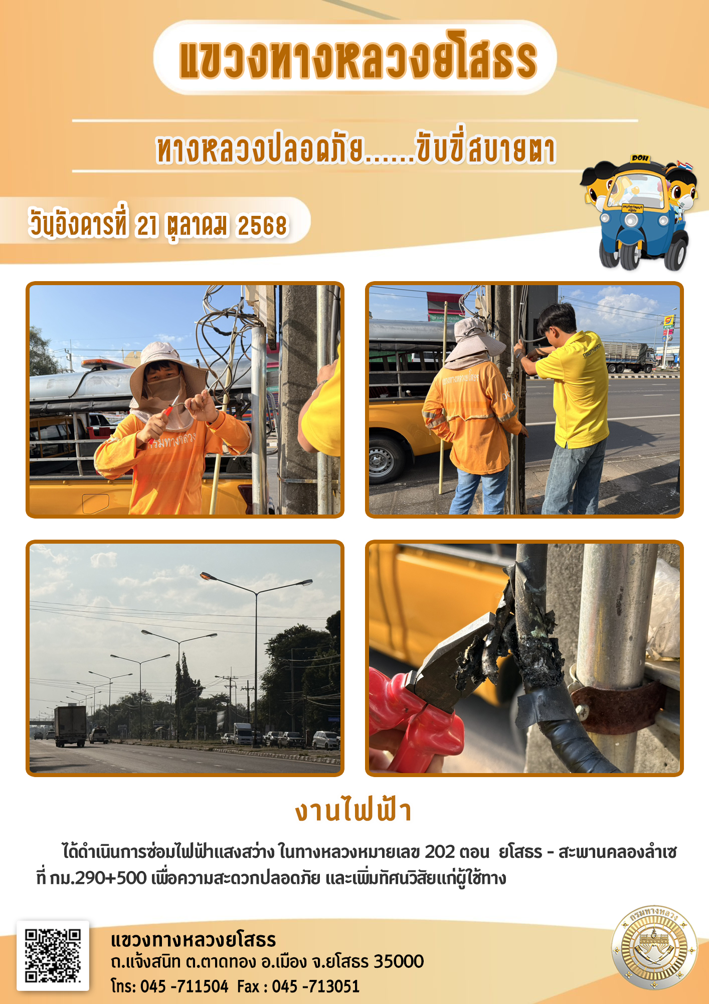 วันอังคารที่ 21 ตุลาคม 2568 งานไฟฟ้า ได้ดำเนินการซ่อบไฟฟ้าแสงสว่าง ในทางหลวงหมายเลข 202 ตอน ยโสรร - สะพานคลองลำเซ ที่ กม.290+500 เพื่อความสะดวกปลอดภัย และเพิ่มทัศนวิสัยแก่ผู้ใช้ทาง