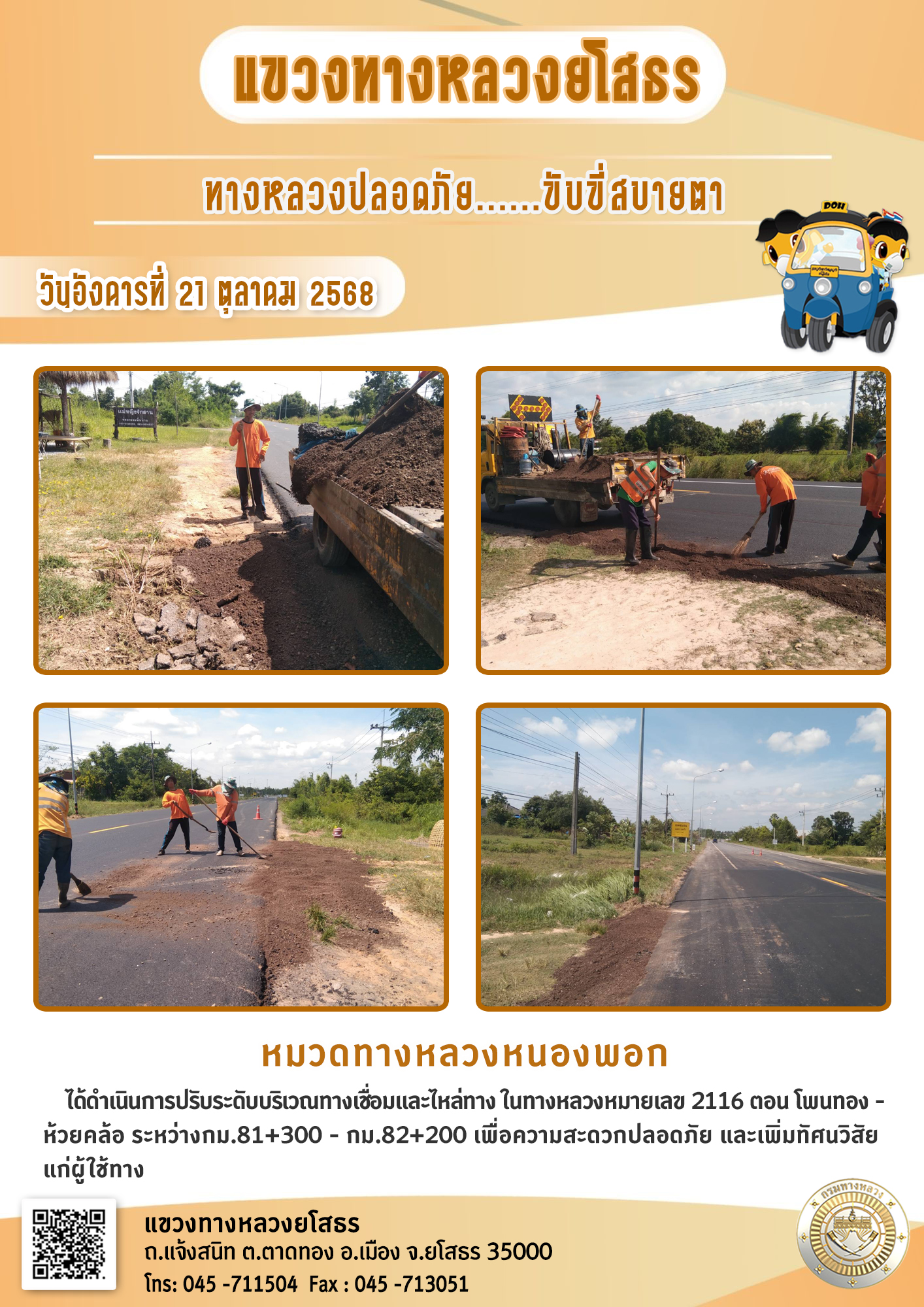 วันอังคารที่ 21 ตุลาคม 2568 หมวดทางหลวงหนองพอก ได้ดำเนินการปรับระดับบริเวณทางเชื่อมและไหล่ทาง ในทางหลวงหมายเลข 2116 ตอน โพนทอง - ห้วยคล้อ ระหว่าง กม.81+300 - กม.82+200 เพื่อความสะดวกปลอดภัย และเพิ่มทัศบวิสัย แก่ผู้ใช้ทาง