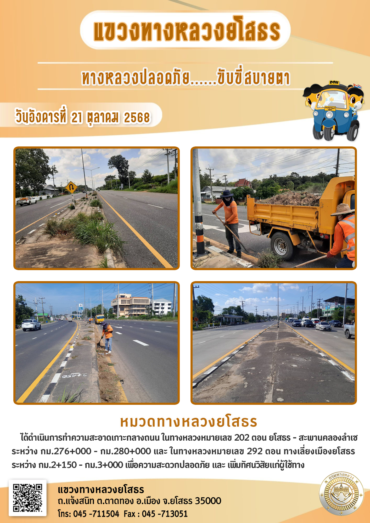 วันอังคารที่ 21 ตุลาคม 2568 หมวดทางหลวงยโสธร ได้ดำเนินการทำความสะอาดเกาะกลางถนน ในทางหลวงหมายเลข 202 ตอน ยโสรร - สะพานคลองล่าเซ ระหว่าง กม.276+000 - กม.280+000 และทางหลวงหมายเลข 292 ตอน ทางเลี่ยงเมืองยโสธร ระหว่าง กม.2+150 - กม.3+000 เพื่อความสะดวก
