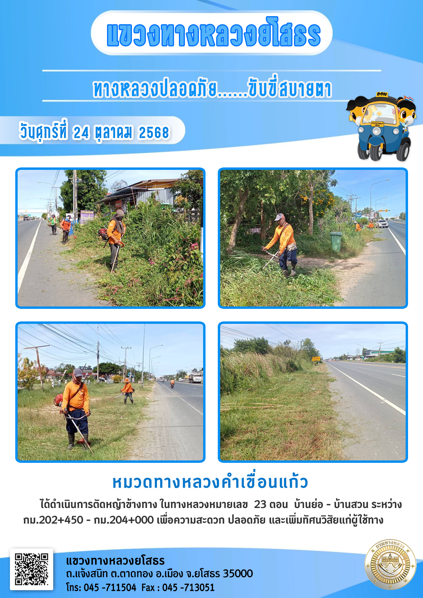 วันศุกร์ที่ 24 ตุลาคม 2568 หมวดทางหลวงคำเขื่อนแก้ว ได้ดำเนินการตัดหญ้าข้างทาง ในทางหลวงหมายเลข 23 ตอน บ้านย่อ - บ้านสวน ระหว่าง กม.202+450 - กม.204+000 เพื่อความสะดวก ปลอดภัย และเพิ่มทัศนวิสัยแก่ผู้ใช้ทาง