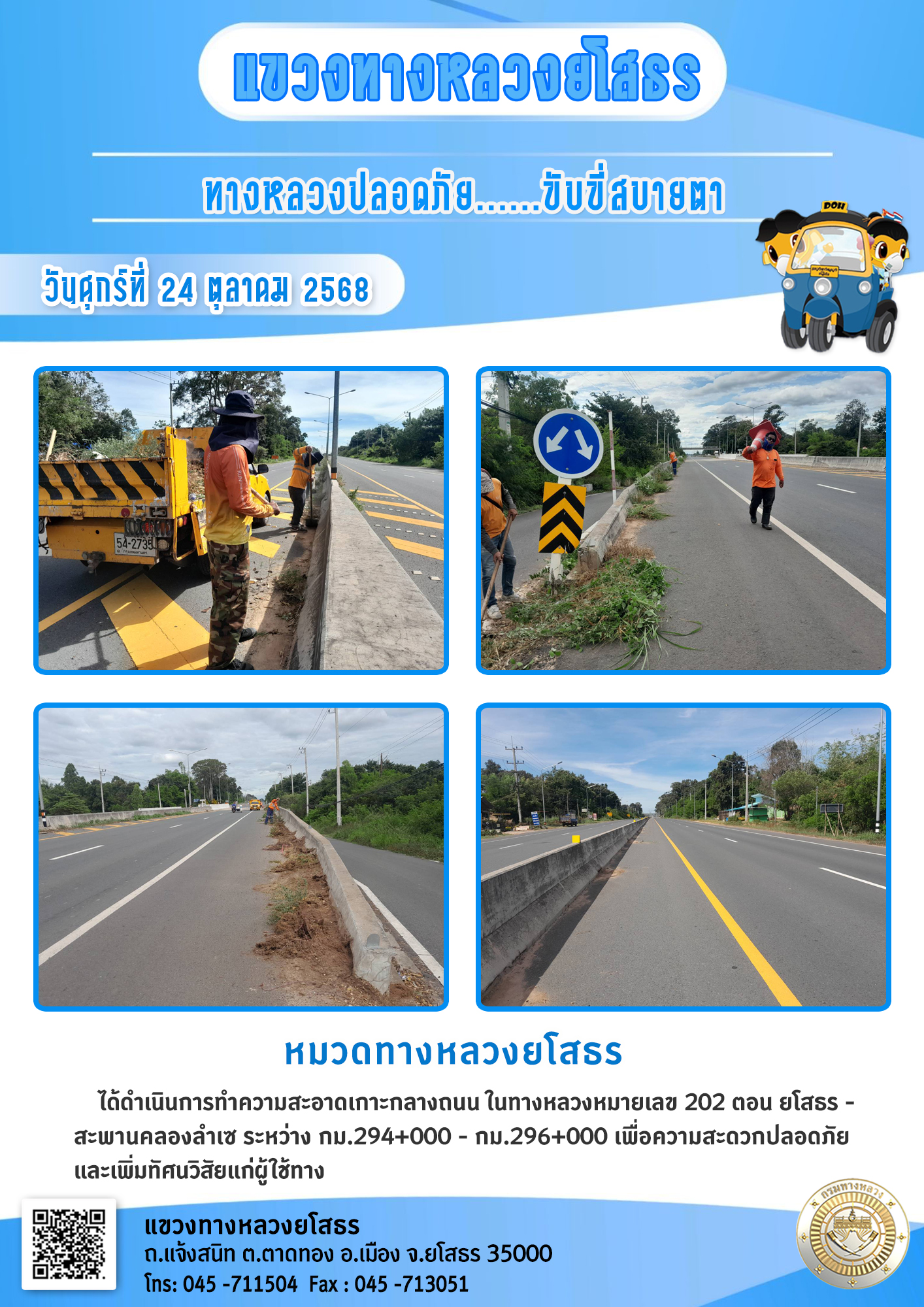 วันศุกร์ที่ 24 ตุลาคม 2568 หมวดทางหลวงยโสธร ได้ดำเนินการทำความสะอาดเกาะกลางถนน ในทางหลวงหมายเลข 202 ตอน ยโสธร - สะพานคลองลำเซ ระหว่าง กม.294+0000 - กม.296+000 เพื่อความสะดวกปลอดภัย และเพิ่มทัศนวิสัยแก่ผู้ใช้ทาง