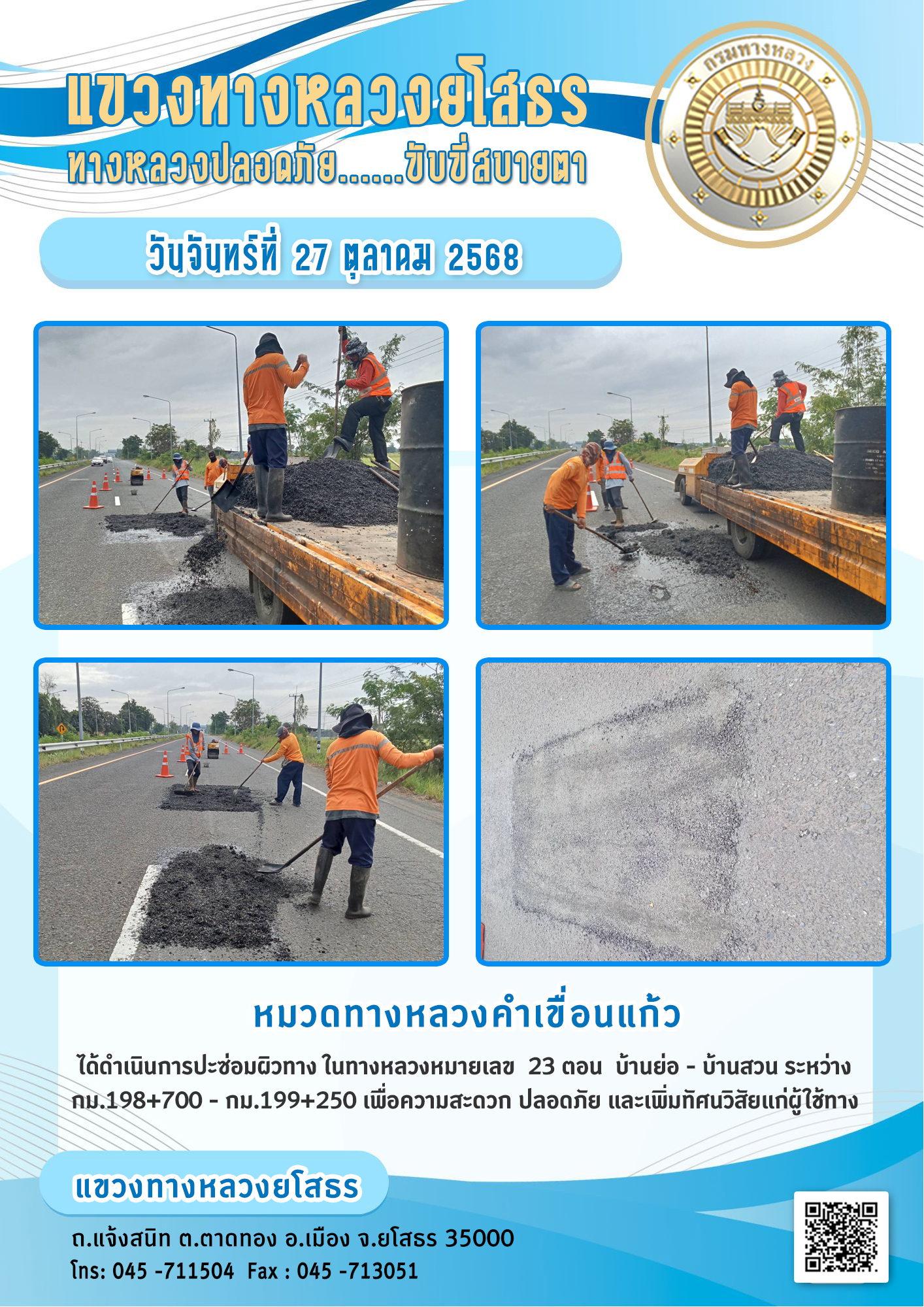 วันจันทร์ที่ 27 ตุลาคม 2568 หมวดทางหลวงคำเขื่อนแก้ว ได้ดำเนินการปะซ่อมผิวทาง ในทางหลวงหมายเลข 23 ตอน บ้านย่อ - บ้านสวน ระหว่าง กม.198+700 - กม.199+250 เพื่อความสะดวก ปลอดภัย และเพิ่มทัศนวิสัยแก่ผู้ใช้ทาง
