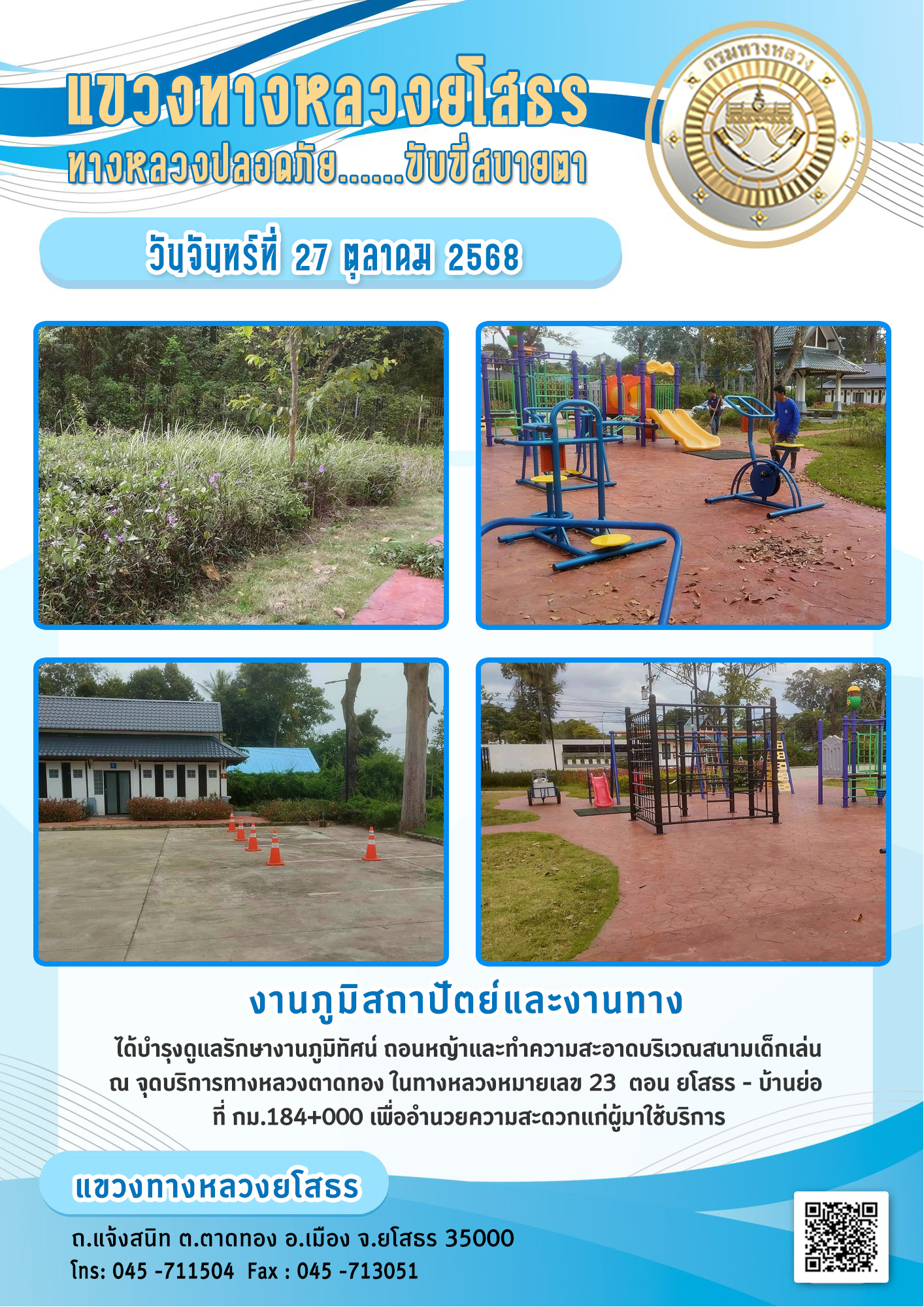วันจันทร์ที่ 27 ตุลาคม 2568 งานภูมิสถาปัตย์และงานทาง ได้บำรุงดูแลรักษางานภูมิทัศน์ ถอนหญ้าและทำความสะอาดบริเวณสนามเด็กเล่น ณ จุดบริการทางหลวงตาดทอง ในทางหลวงหมายเลข 23 ตอน ยโสรร - บ้านย่อ ที่ กม.184+000 เพื่ออำนวยความสะดวกแก่ผู้มาใช้บริการ