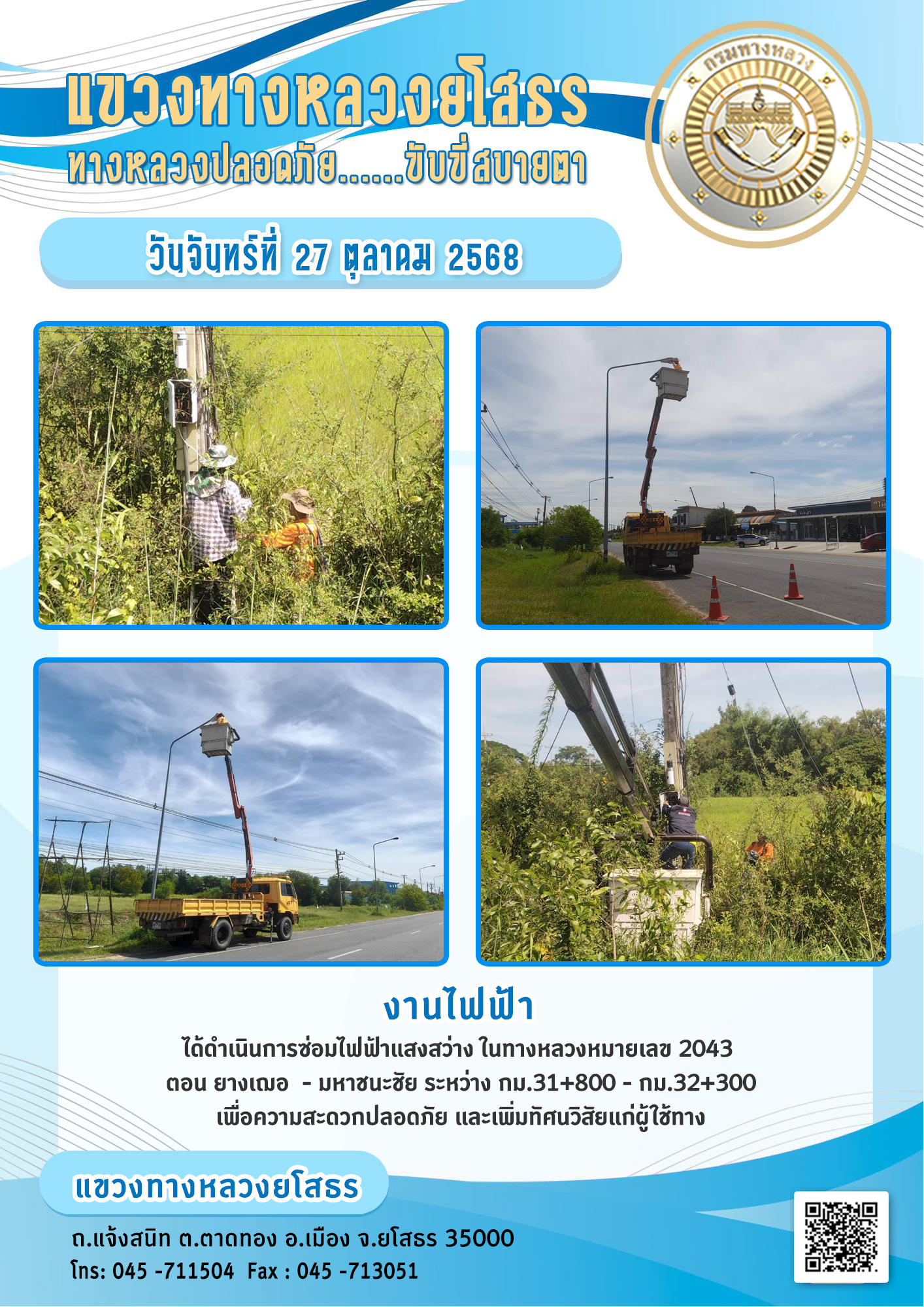 วันจันทร์ที่ 27 ตุลาคม 2568 งานไฟฟ้า ได้ดำเนินการซ่อมไฟฟ้าแสงสว่าง ในทางหลวงหมายเลข 2043 ตอน ยางเฌอ - มหาชนะชัย ระหว่าง กม.31+800 - กม.32+300 เพื่อความสะดวกปลอดภัย และเพิ่มทัศนวิสัยแก่ผู้ใช้ทาง