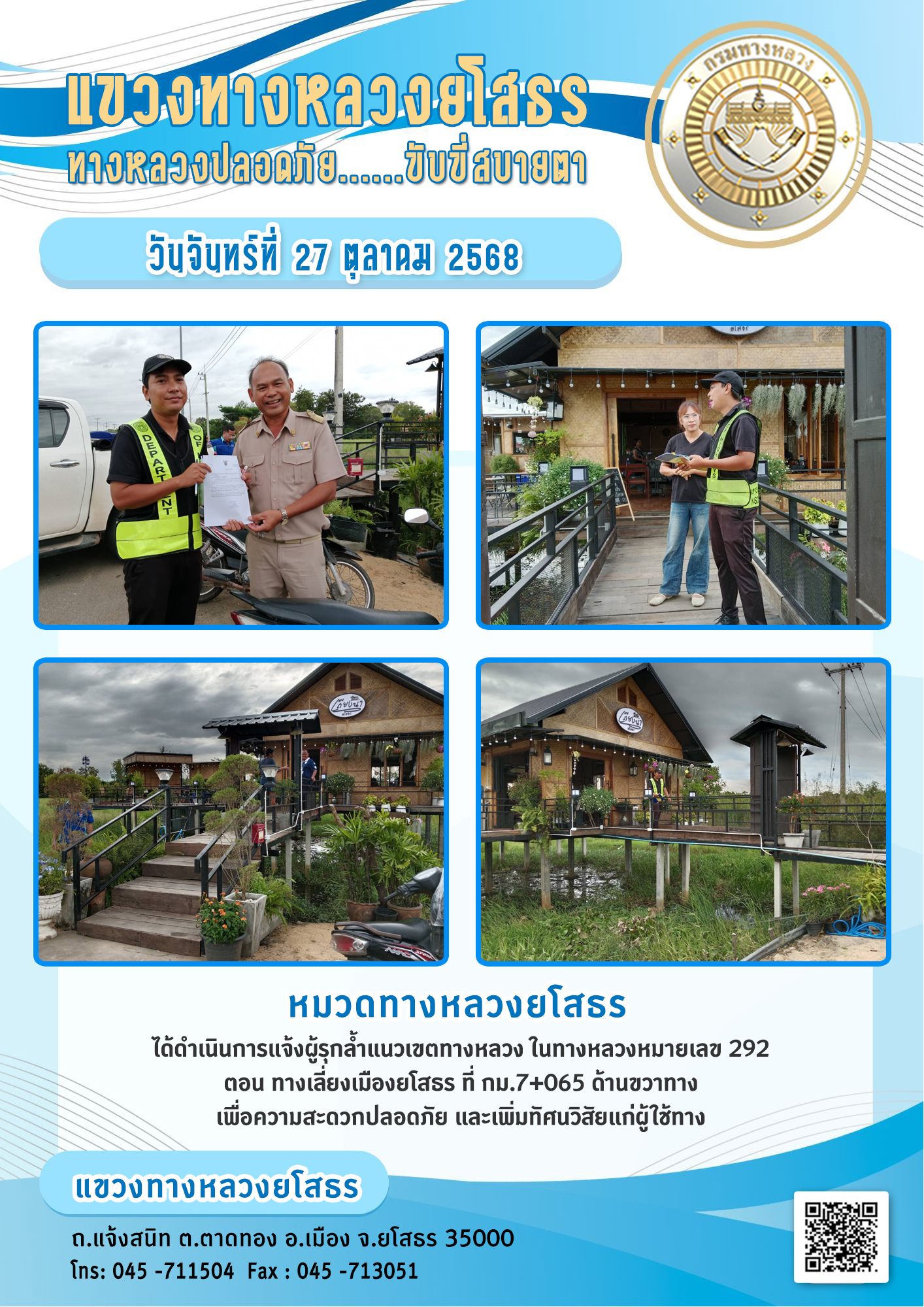 วันจันทร์ที่ 27 ตุลาคม 2568 หมวดทางหลวงยโสธร ได้ดำเนินการแจ้งผู้รุกล้ำแนวเขตทางหลวง ในทางหลวงหมายเลข 292 ตอน ทางเลี่ยงเมืองยโสธร ที่ กม.7+065 ด้านขวาทาง เพื่อความสะดวกปลอดภัย และเพิ่มทัศนวิสัยแก่ผู้ใช้ทาง