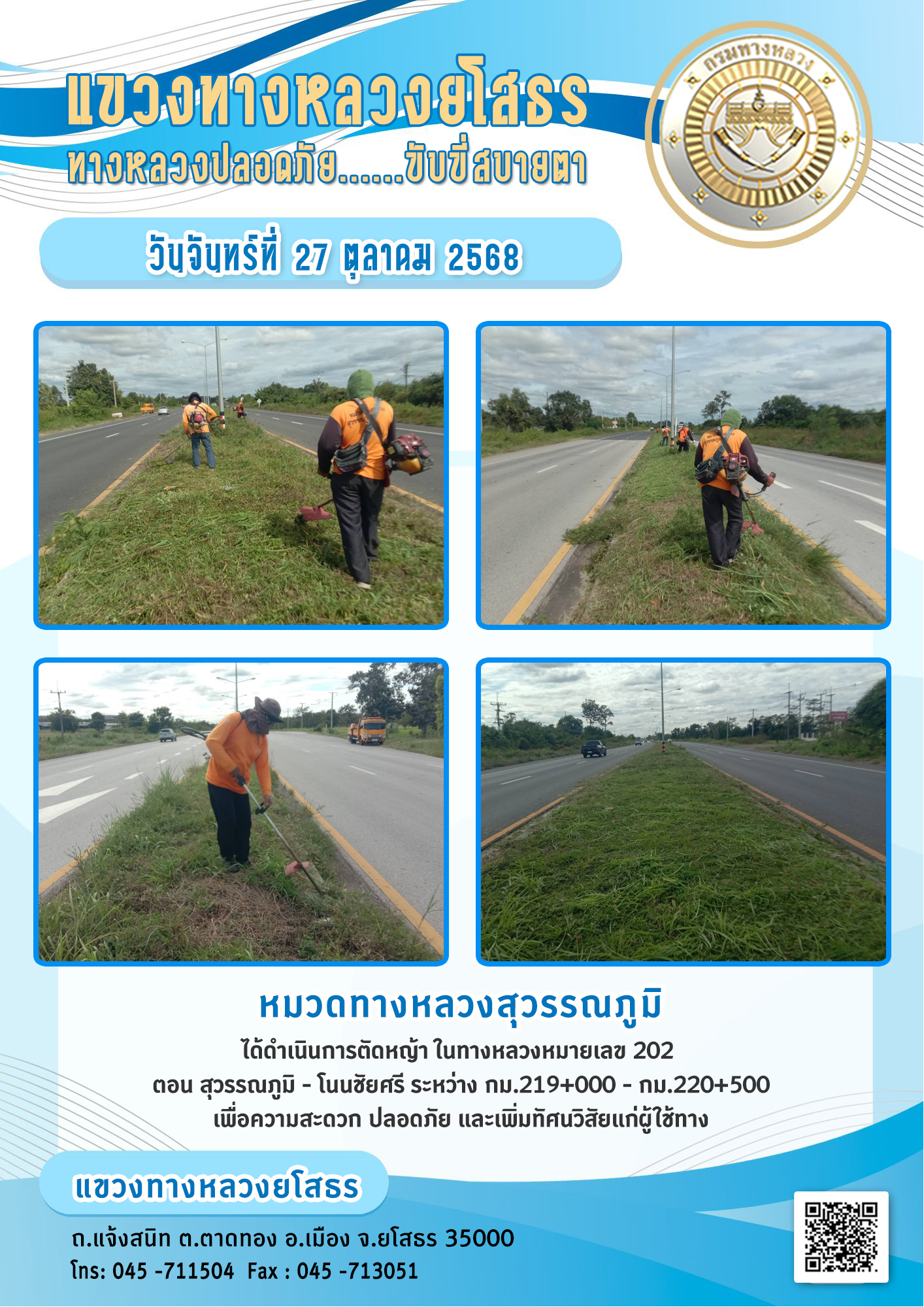 - [10:21] ทั่วไป วันอังคารที่ 31 มีนาคม 2569 งานอำนวยความปลอดภัย ได้ดำเนินการตัดหญ้า ทำความสะอาดภายในบริเวณแขวงทางหลวงยโสธร