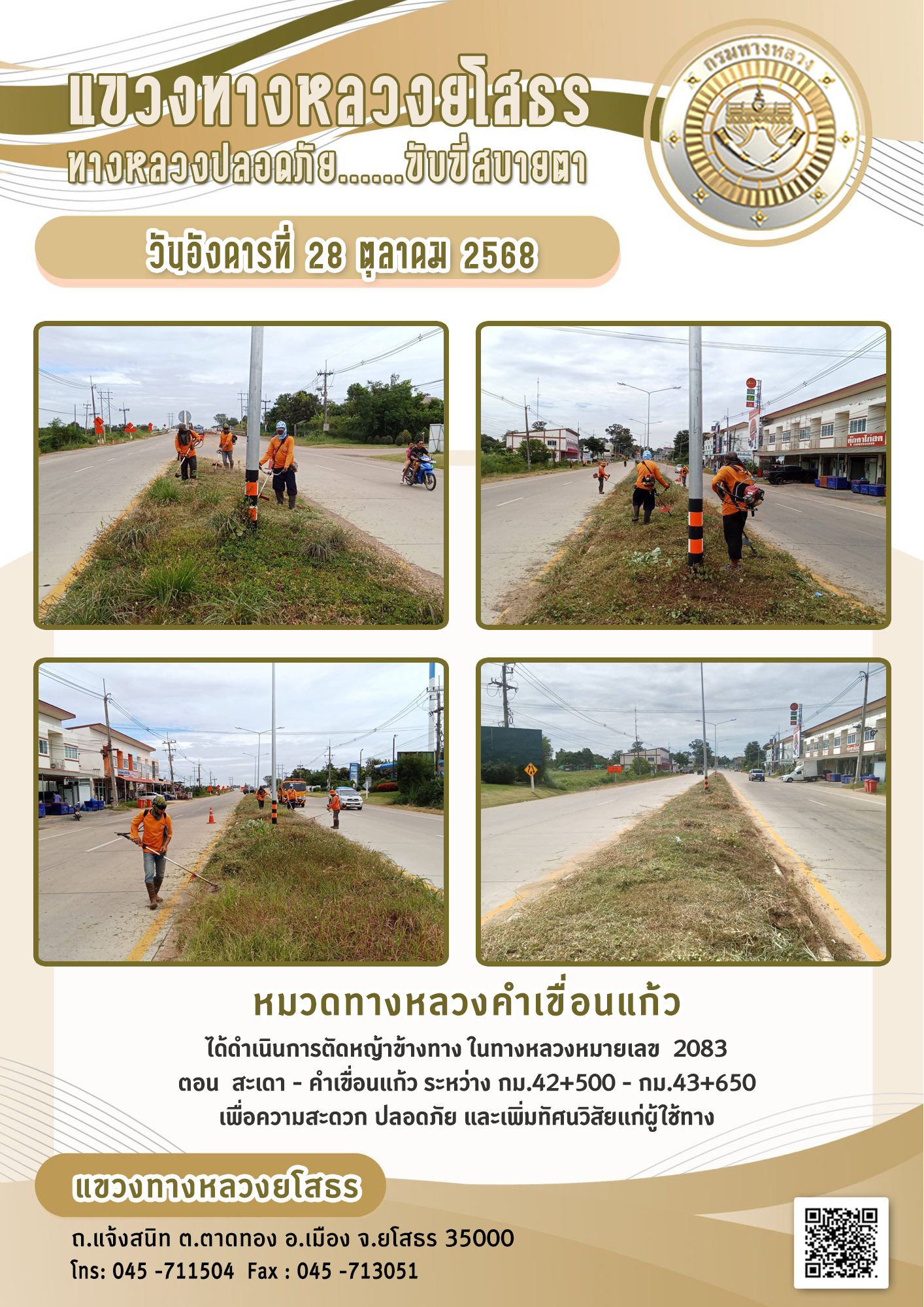 วันอังคารที่ 28 ตุลาคม 2568 หมวดทางหลวงคำเขื่อนแก้ว ได้ดำเนินการตัดหญ้าข้างทาง ในทางหลวงหมายเลข 2083 ตอน สะเดา - คำเขื่อนแก้ว ระหว่าง กม.42+500 - กม.43+650 เพื่อความสะดวก ปลอดภัย และเพิ่มทัศนวิสัยแก่ผู้ใช้ทาง