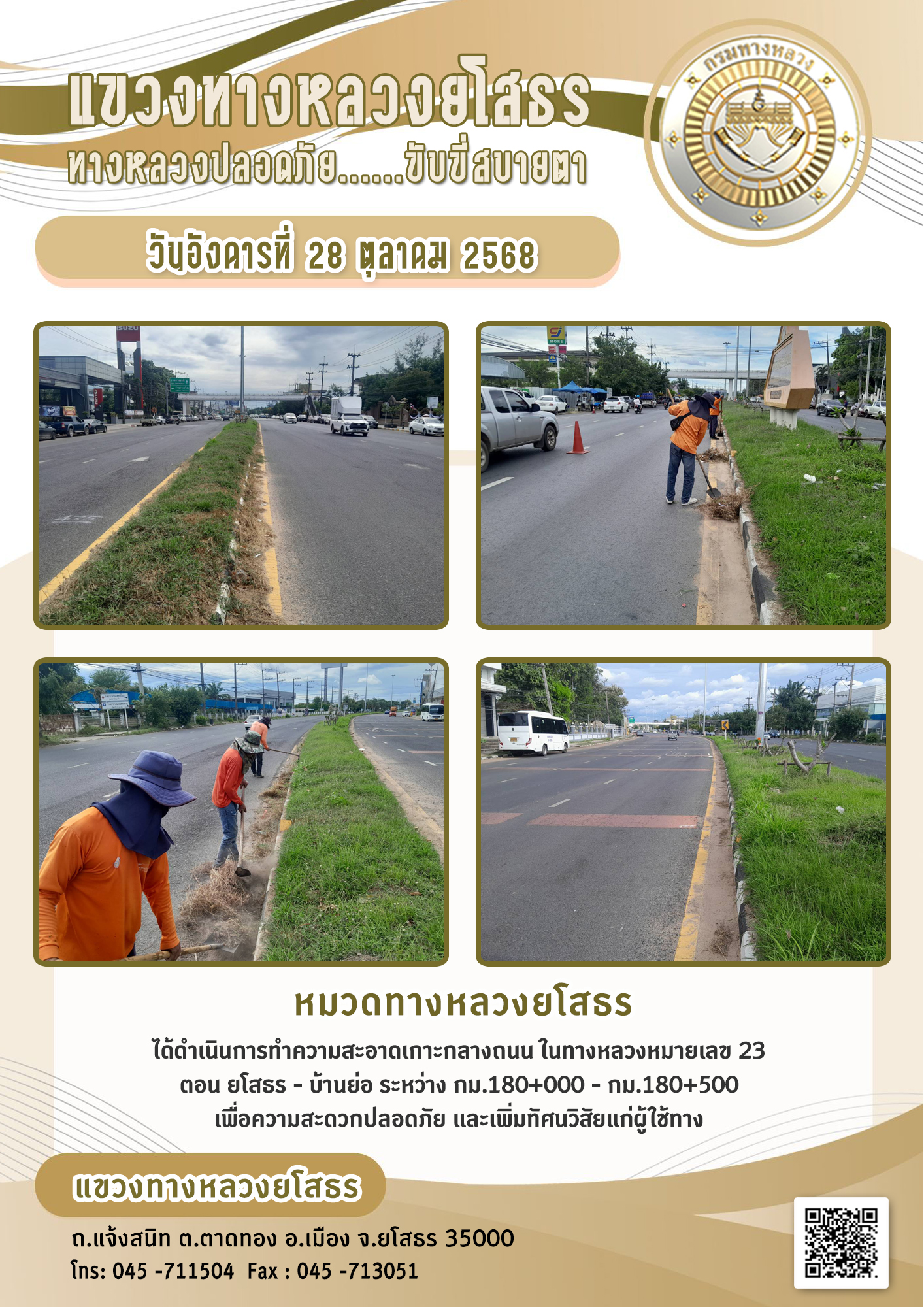 วันอังคารที่ 28 ตุลาคม 2568 หมวดทางหลวงยโสธร ได้ดำเนินการทำความสะอาดเกาะกลางถนน ในทางหลวงหมายเลข 23 ตอน ยโสธร - บ้านย่อ ระหว่าง กม.180+000 - กม.180+500 เพื่อความสะดวกปลอดภัย และเพิ่มทัศนวิสัยแก่ผู้ใช้ทาง
