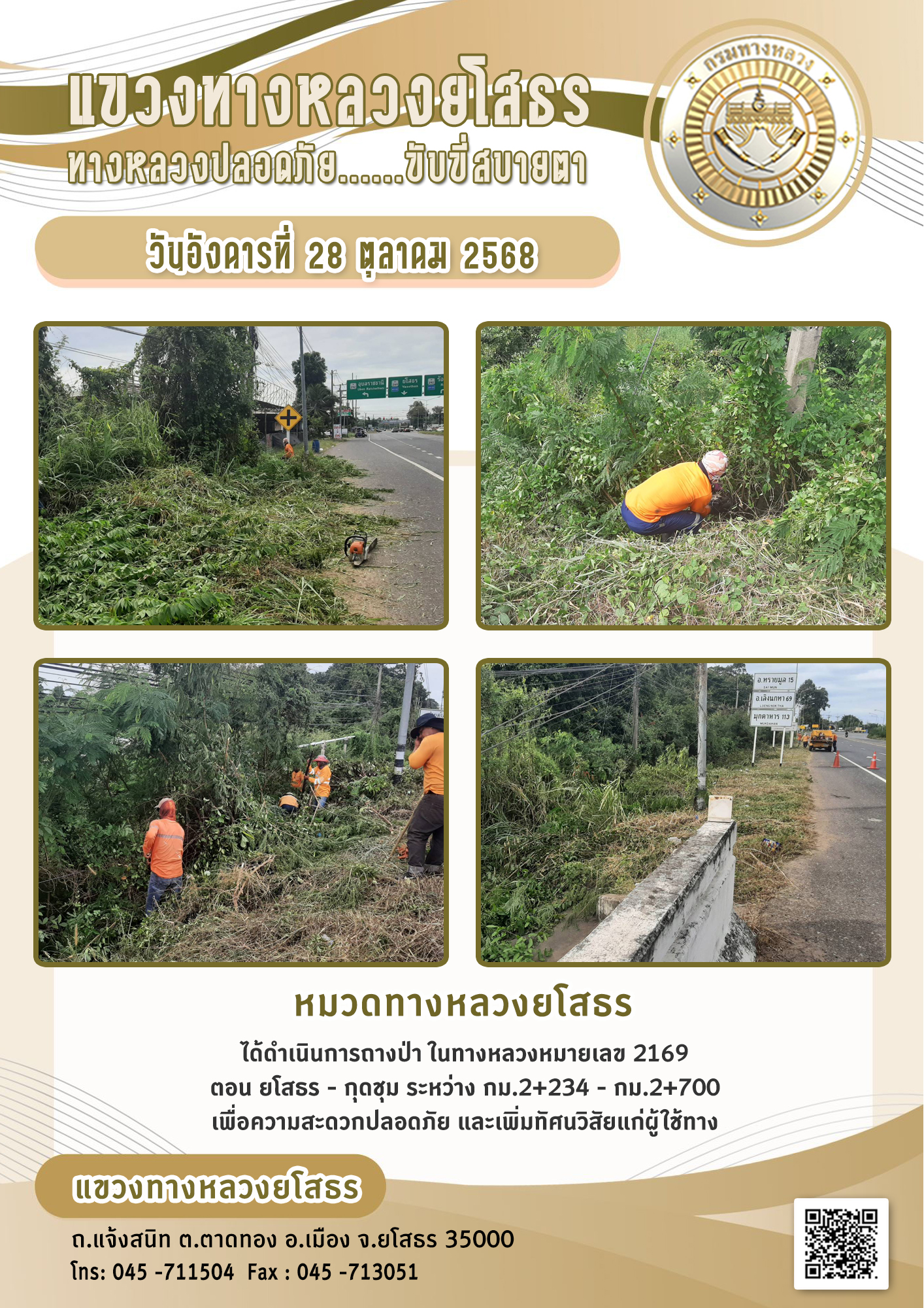 วันอังคารที่ 28 ตุลาคม 2568 หมวดทางหลวงยโสธร ได้ดำเนินการถางป่า ในทางหลวงหมายเลข 2169 ตอน ยโสธร - กุดชุม ระหว่าง กม.2+234 - กม.2+700 เพื่อความสะดวกปลอดภัย และเพิ่มทัศนวิสัยแก่ผู้ใช้ทาง