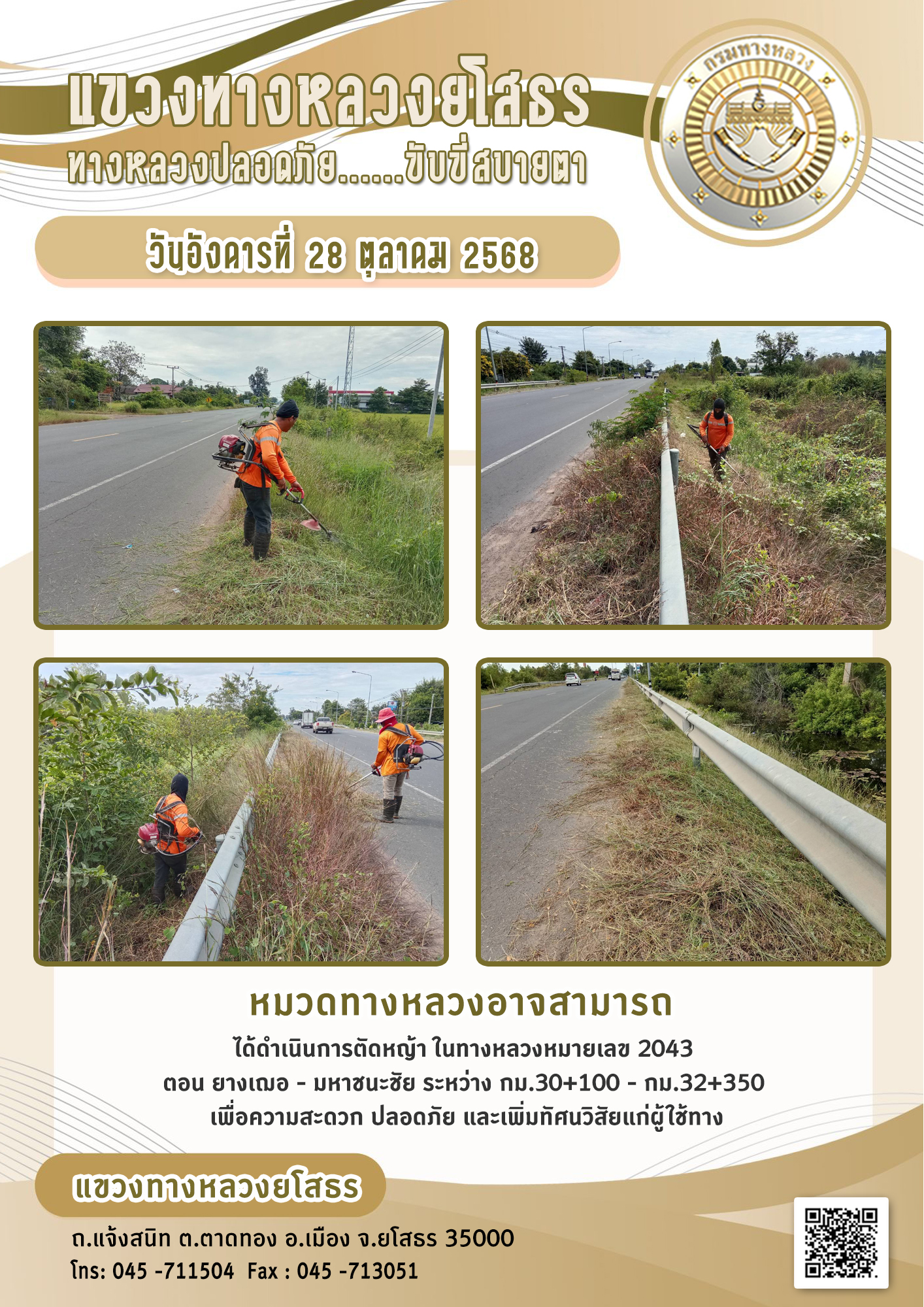 วันอังคารที่ 28 ตุลาคม 2568 หมวดทางหลวงอาจสามารถ ได้ดำเนินการตัดหญ้า ในทางหลวงหมายเลข 2043 ตอน ยางเฌอ - มหาชนะชัย ระหว่าง กม.30+100 - กม.32+350 เพื่อความสะดวก ปลอดภัย และเพิ่มทัศนวิสัยแก่ผู้ใช้ทาง