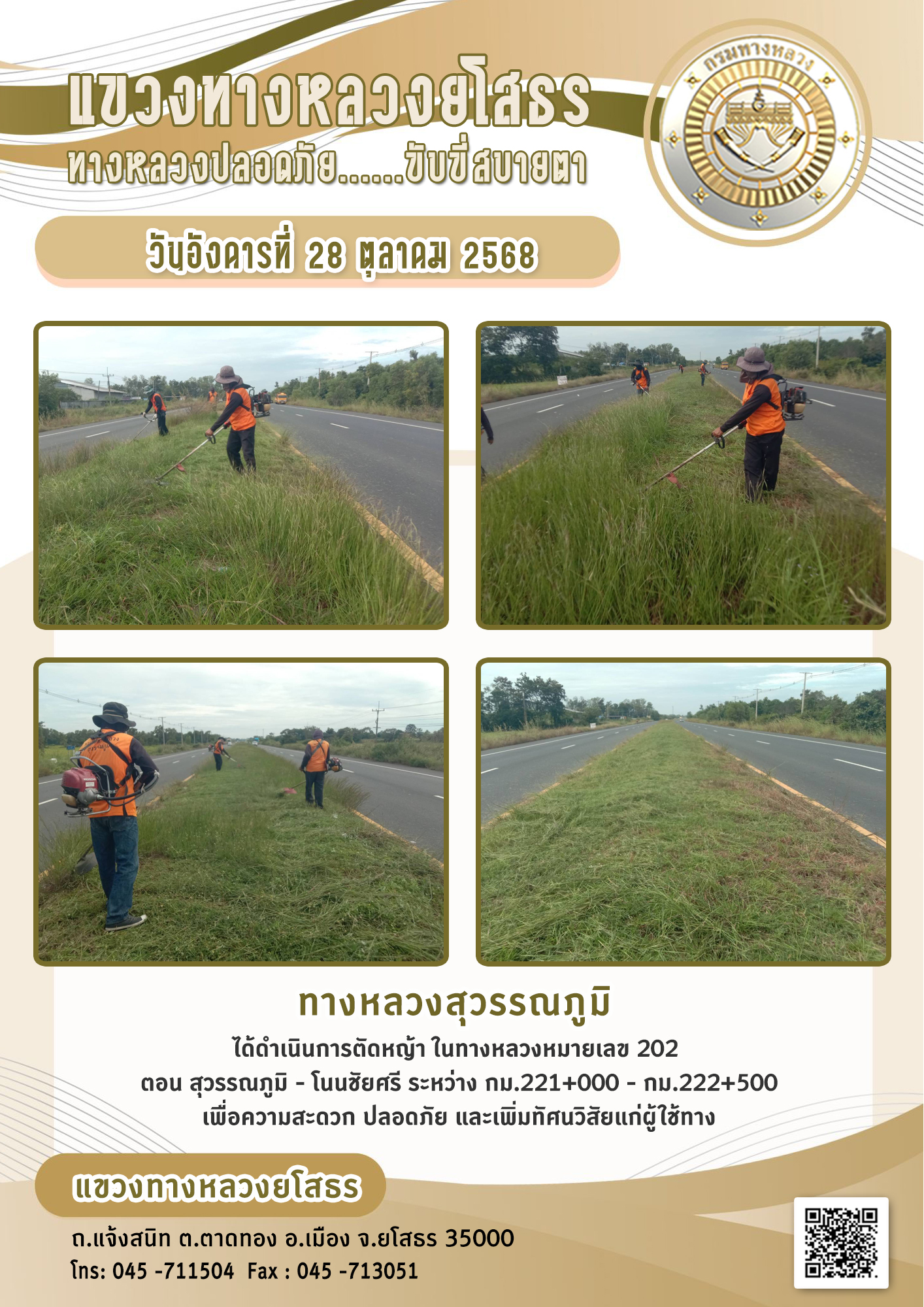 - [10:21] ทั่วไป วันอังคารที่ 31 มีนาคม 2569 งานอำนวยความปลอดภัย ได้ดำเนินการตัดหญ้า ทำความสะอาดภายในบริเวณแขวงทางหลวงยโสธร