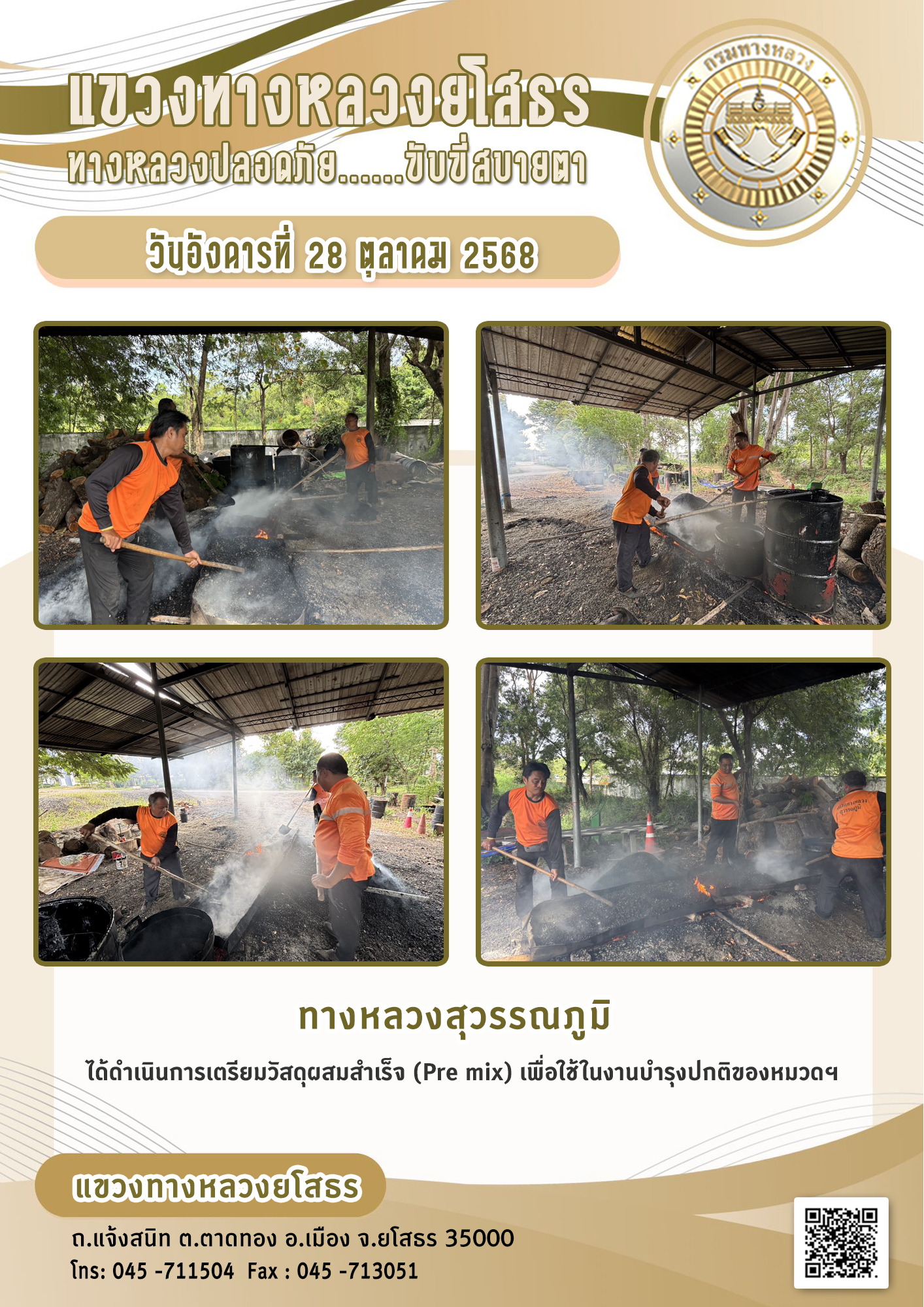 วันอังคารที่ 28 ตุลาคม 2568 หมวดทางหลวงสุวรรณภูมิ ได้ดำเนินการเตรียมวัสดุผสมสำเร็จ (Pre mix) เพื่อใช้ในงานบำรุงปกติของหมวดฯ