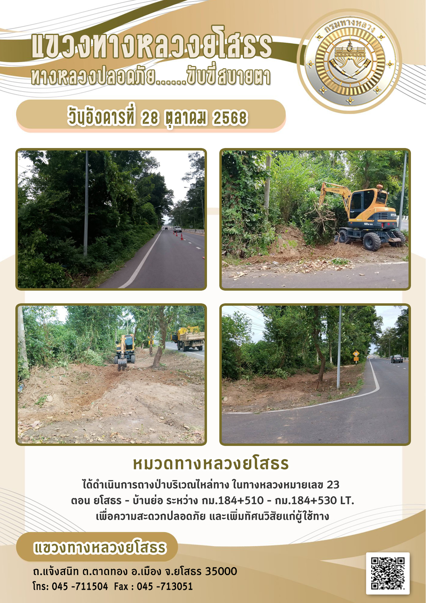 วันอังคารที่ 28 ตุลาคม 2568 หมวดทางหลวงยโสธร ได้ดำเนินการถางป่าบริเวณไหล่ทาง ในทางหลวงหมายเลข 23 ตอน ยโสธร - บ้านย่อ ระหว่าง กม.184+510 - กม.184+530 LT. เพื่อความสะดวกปลอดภัย และเพิ่มทัศนวิสัยแก่ผู้ใช้ทาง