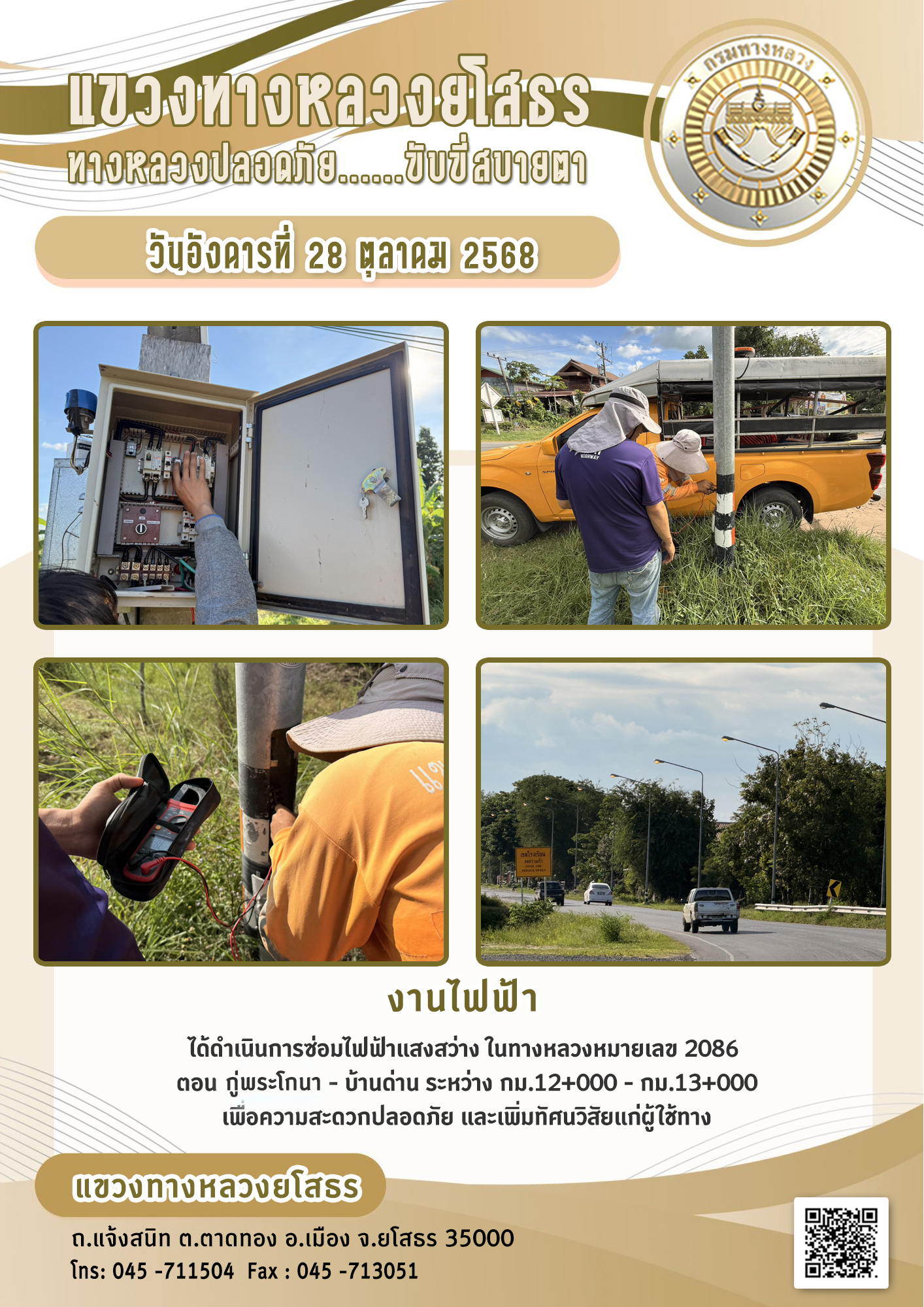 วันอังคารที่ 28 ตุลาคม 2568 งานไฟฟ้า ได้ดำเนินการซ่อมไฟฟ้าแสงสว่าง ในทางหลวงหมายเลข 2086 ตอน กู่พระโกนา - บ้านด่าน ระหว่าง กม.12+000 - กม.13+000 เพื่อความสะดวกปลอดภัย และเพิ่มทัศนวิสัยแก่ผู้ใช้ทาง