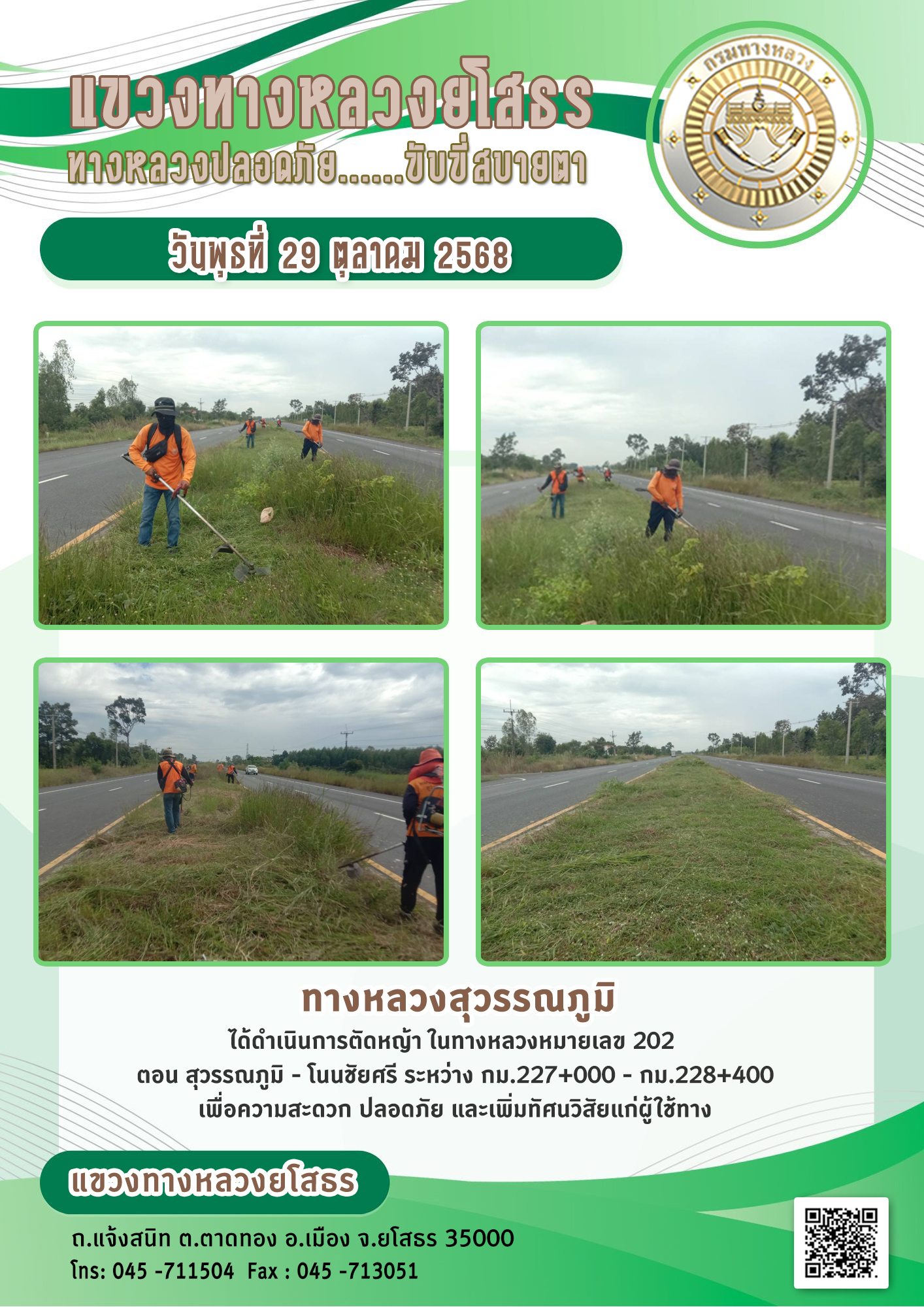 - [10:21] ทั่วไป วันอังคารที่ 31 มีนาคม 2569 งานอำนวยความปลอดภัย ได้ดำเนินการตัดหญ้า ทำความสะอาดภายในบริเวณแขวงทางหลวงยโสธร