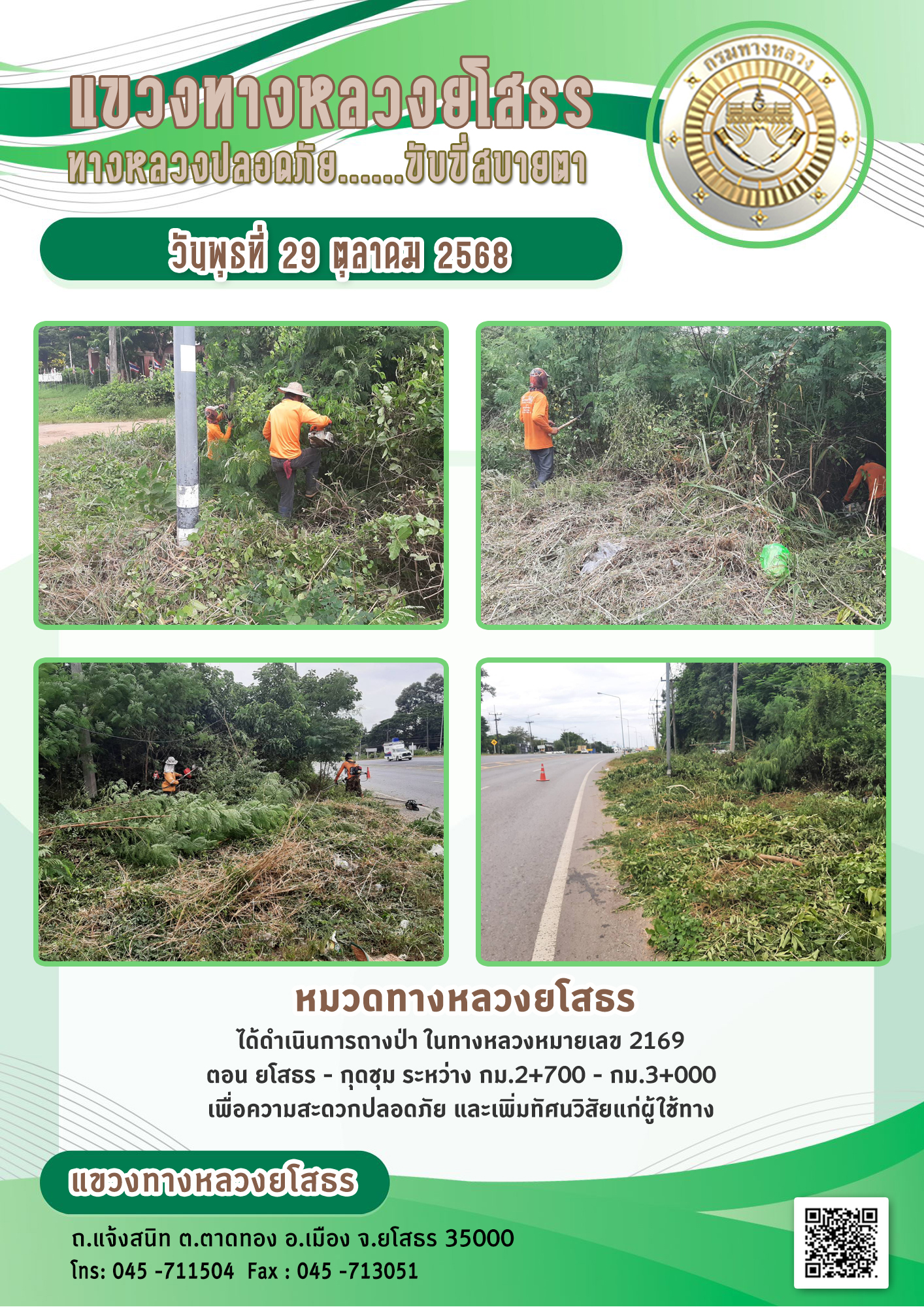 วันพุธที่ 29 ตุลาคม 2568 หมวดทางหลวงยโสธร ได้ดำเนินการถางป่า ในทางหลวงหมายเลข 2169 ตอน ยโสธร - กุดชุม ระหว่าง กม.2+700 - กม.3+000 เพื่อความสะดวกปลอดภัย และเพิ่มทัศนวิสัยแก่ผู้ใช้ทาง