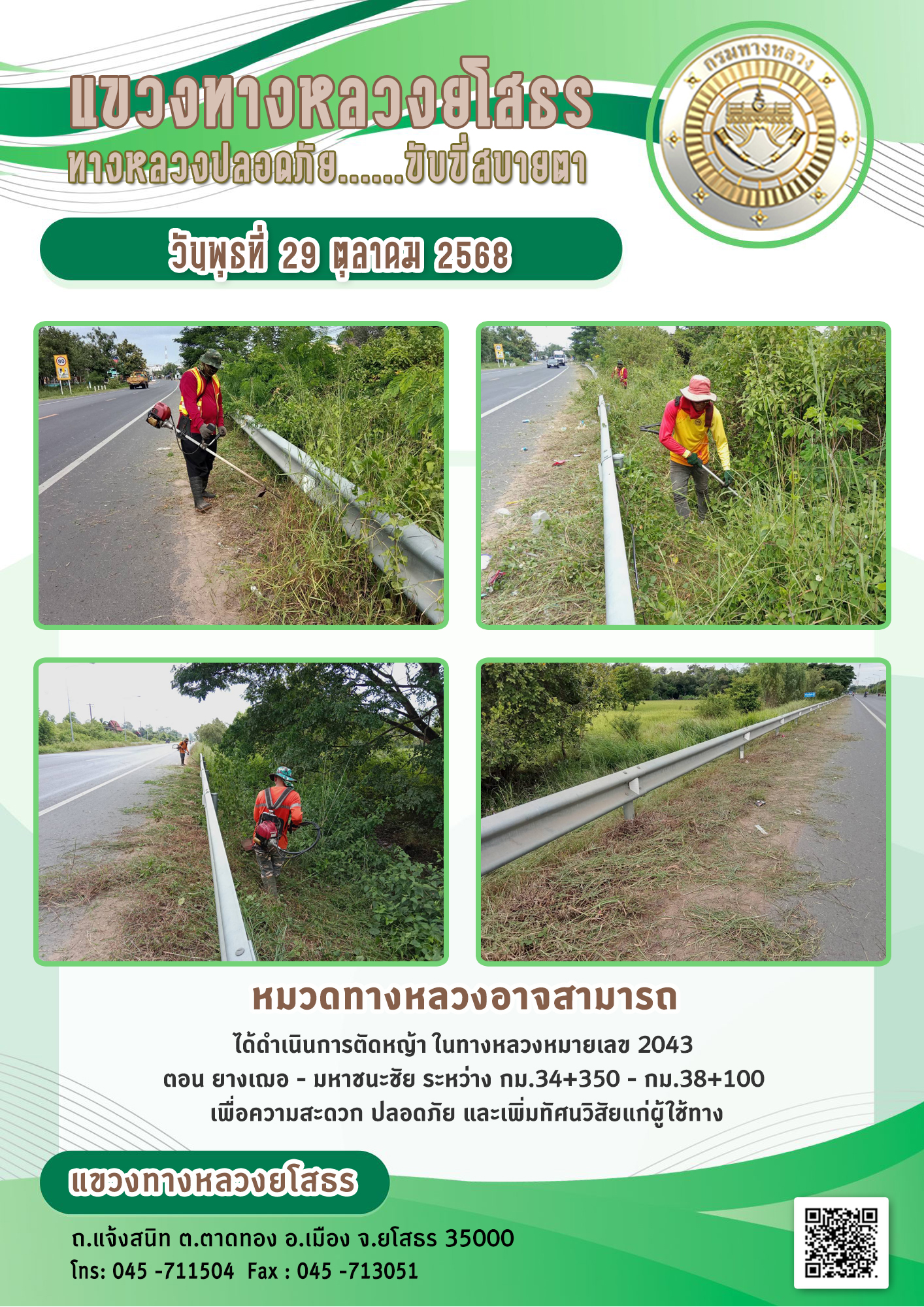 วันพุธที่ 29 ตุลาคม 2568 หมวดทางหลวงอาจสามารถ ได้ดำเนินการตัดหญ้า ในทางหลวงหมายเลข 2043 ตอน ยางเฌอ - มหาชนะชัย ระหว่าง กม.34+350 - กม.38+100 เพื่อความสะดวก ปลอดภัย และเพิ่มทัศนวิสัยแก่ผู้ใช้ทาง