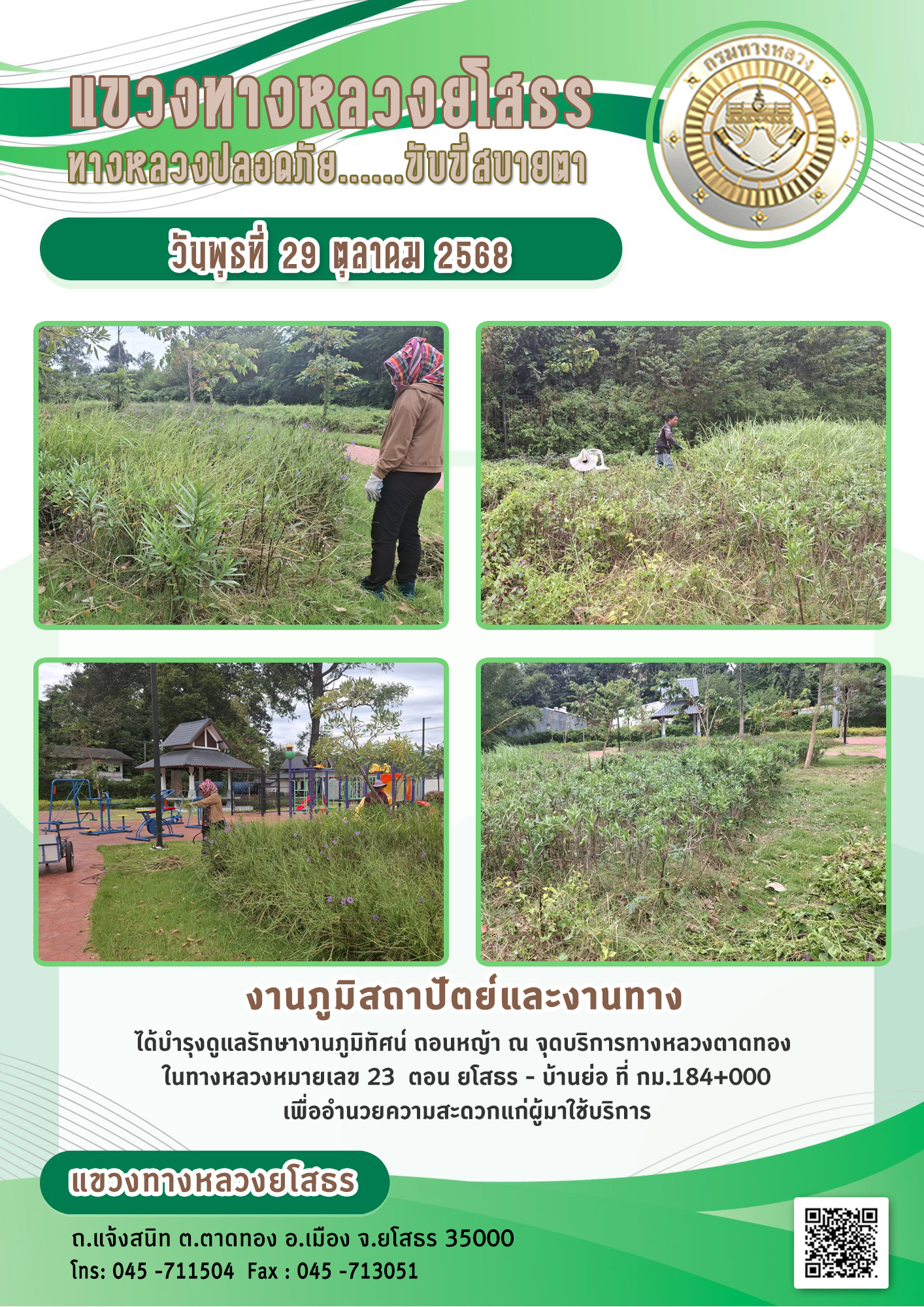วันพุธที่ 29 ตุลาคม 2568 งานภูมิสถาปัตย์และงานทาง ได้บำรุงดูแลรักษางานภูมิทัศน์ ถอนหญ้า ณ จุดบริการทางหลวงตาดทอง ในทางหลวงหมายเลข 23 ตอน ยโสธร - บ้านย่อ ที่ กม.184+000 เพื่ออำนวยความสะดวกแก่ผู้มาใช้บริการ