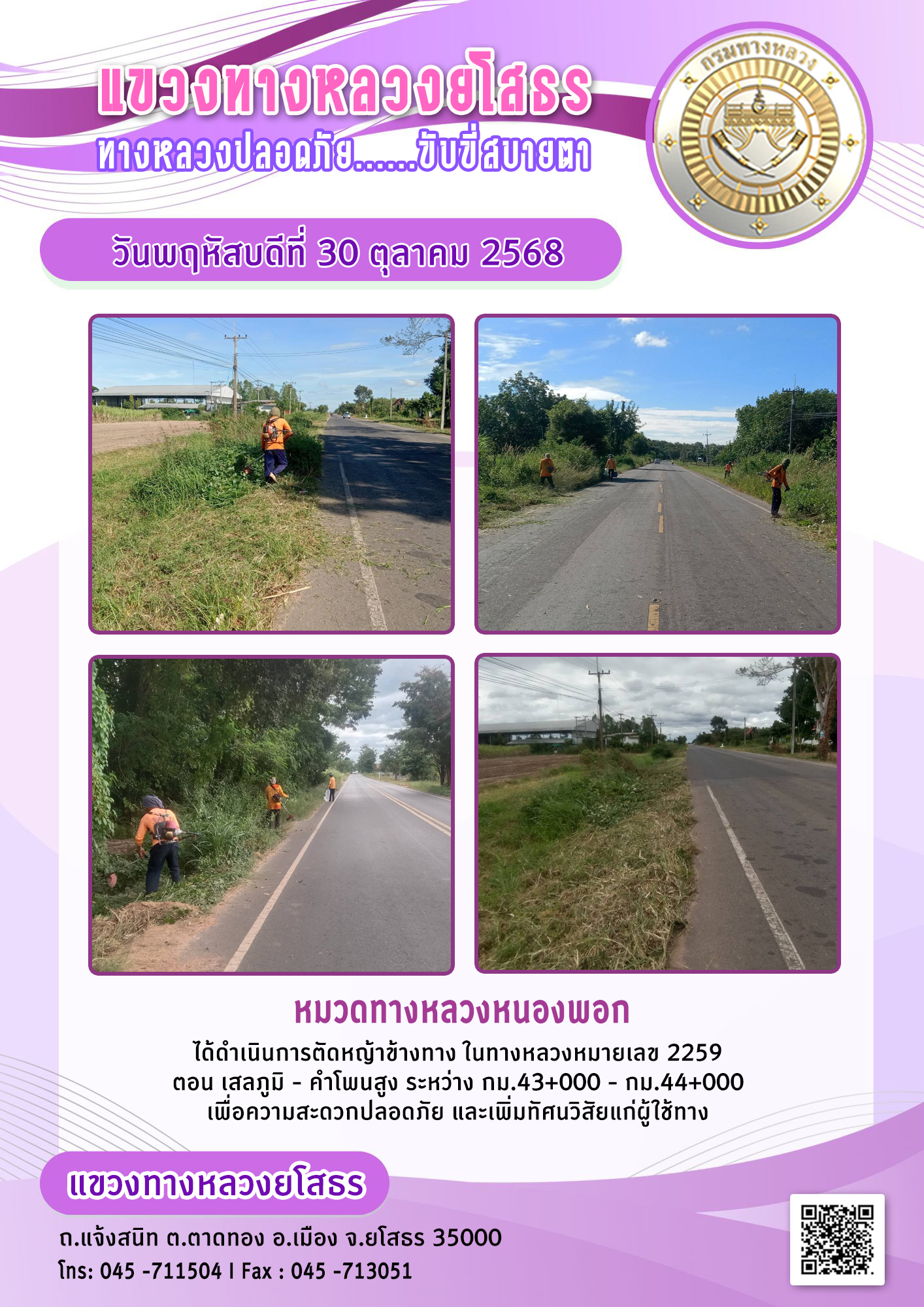 วันพฤหัสบดีที่ 30 ตุลาคม 2568 หมวดทางหลวงหนองพอก ได้ดำเนินการตัดหญ้าข้างทาง ในทางหลวงหมายเลข 2259 ตอน เสลภูมิ - คำโพนสูง ระหว่าง กม.43+000 - กม.44+000 เพื่อความสะดวกปลอดภัย และเพิ่มทัศนวิสัยแก่ผู้ใช้ทาง