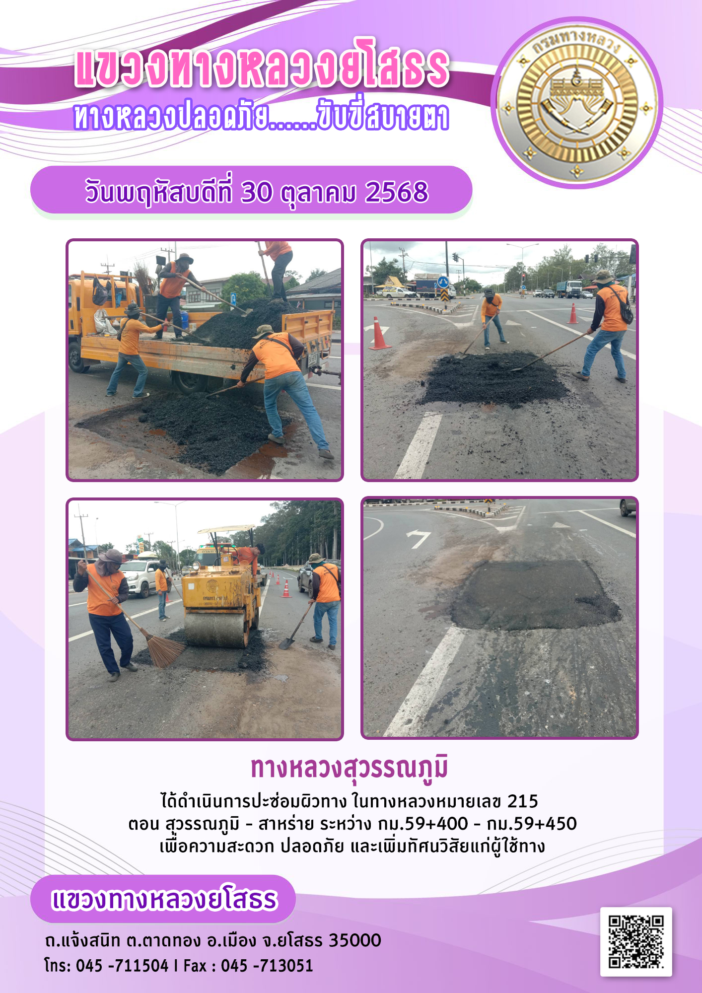 วันพฤหัสบดีที่ 30 ตุลาคม 2568 หมวดทางหลวงสุวรรณภูมิ ได้ดำเนินการปะซ่อมผิวทาง ในทางหลวงหมายเลข 215 ตอน สุวรรณภูมิ - สาหร่าย ระหว่าง กม.59+400 - กม.59+450 เพื่อความสะดวก ปลอดภัย และเพิ่มทัศนวิสัยแก่ผู้ใช้ทาง