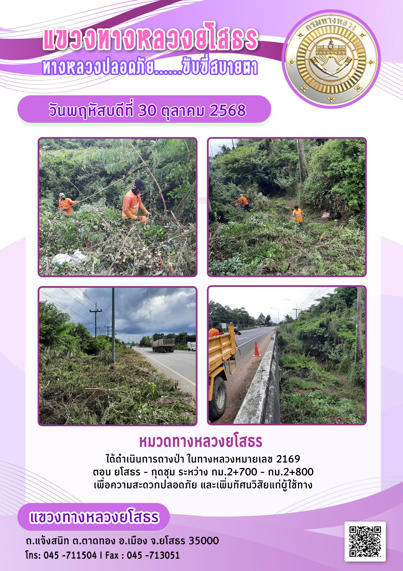 วันพฤหัสบดีที่ 30 ตุลาคม 2568 หมวดทางหลวงยโสธร ได้ดำเนินการถางป่า ในทางหลวงหมายเลข 2169 ตอน ยโสรร - กุดชม ระหว่าง กม.2+700 - กม.2+800 เพื่อความสะดวกปลอดภัย และเพิ่มทัศนวิสัยแก่ผู้ใช้ทาง