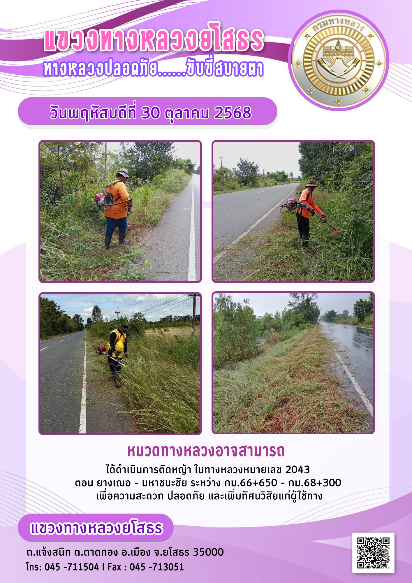 วันพฤหัสบดีที่ 30 ตุลาคม 2568 หมวดทางหลวงอาจสามารถ ได้ดำเนินการตัดหญ้า ในทางหลวงหมายเลข 2043 ตอน ยางเฌอ - มหาชนะชัย ระหว่าง กม.66+650 - กม.68+300 เพื่อความสะดวก ปลอดภัย และเพิ่มทัศนวิสัยแก่ผู้ใช้ทาง