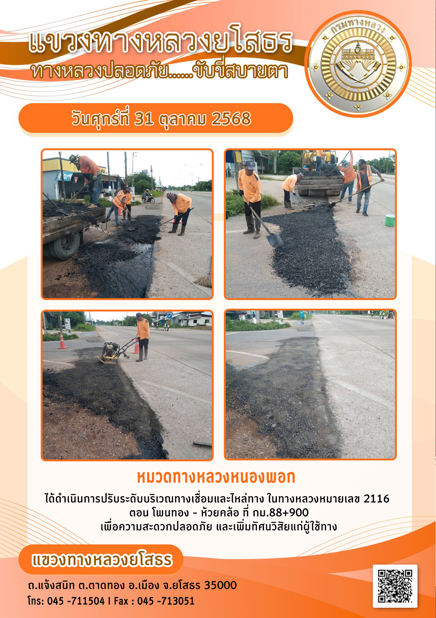 - [10:20] ทั่วไป วันอังคารที่ 31 มีนาคม 2569 หมวดทางหลวงยโสธร ได้ดำเนินการติดตั้งแบบเหล็กเพื่อเตรียมเทเกาะกลางถนน ในทางหลวงหมายเลข 2169 ตอน ยโสธร - กุดชุม ระหว่าง กม.3+000 - กม.3+400 เพื่อความสะดวกปลอดภัย และเพิ่มทัศนวิสัยแก่ผู้ใช้ทาง