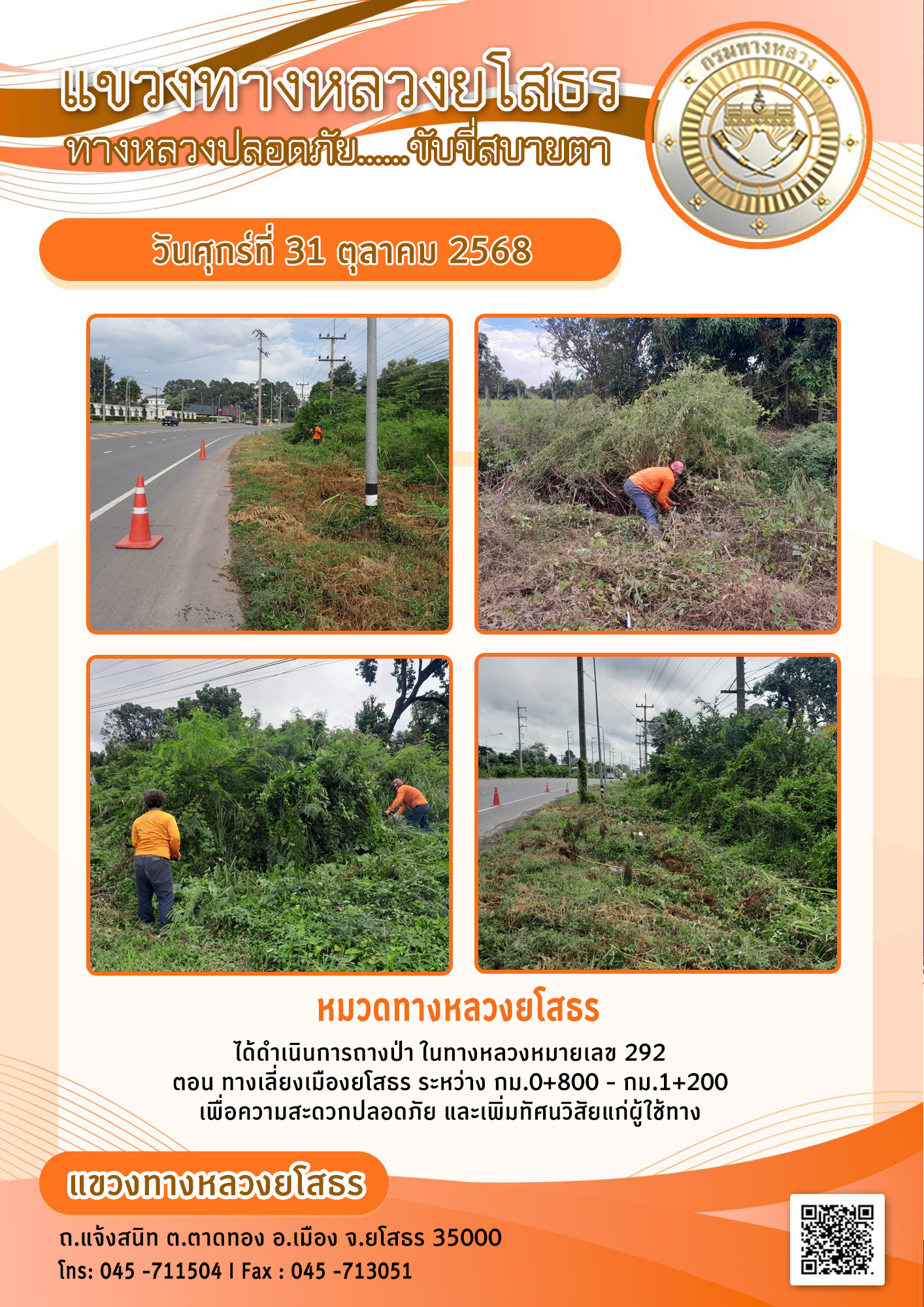 วันศุกร์ที่ 31 ตุลาคม 2568 หมวดทางหลวงยโสธร ได้ดำเนินการถางป่า ในทางหลวงหมายเลข 292 ตอน ทางเลี่ยงเมืองยโสธร ระหว่าง กม.0+800 - กม.1+200 เพื่อความสะดวกปลอดภัย และเพิ่มทัศนวิสัยแก่ผู้ใช้ทาง