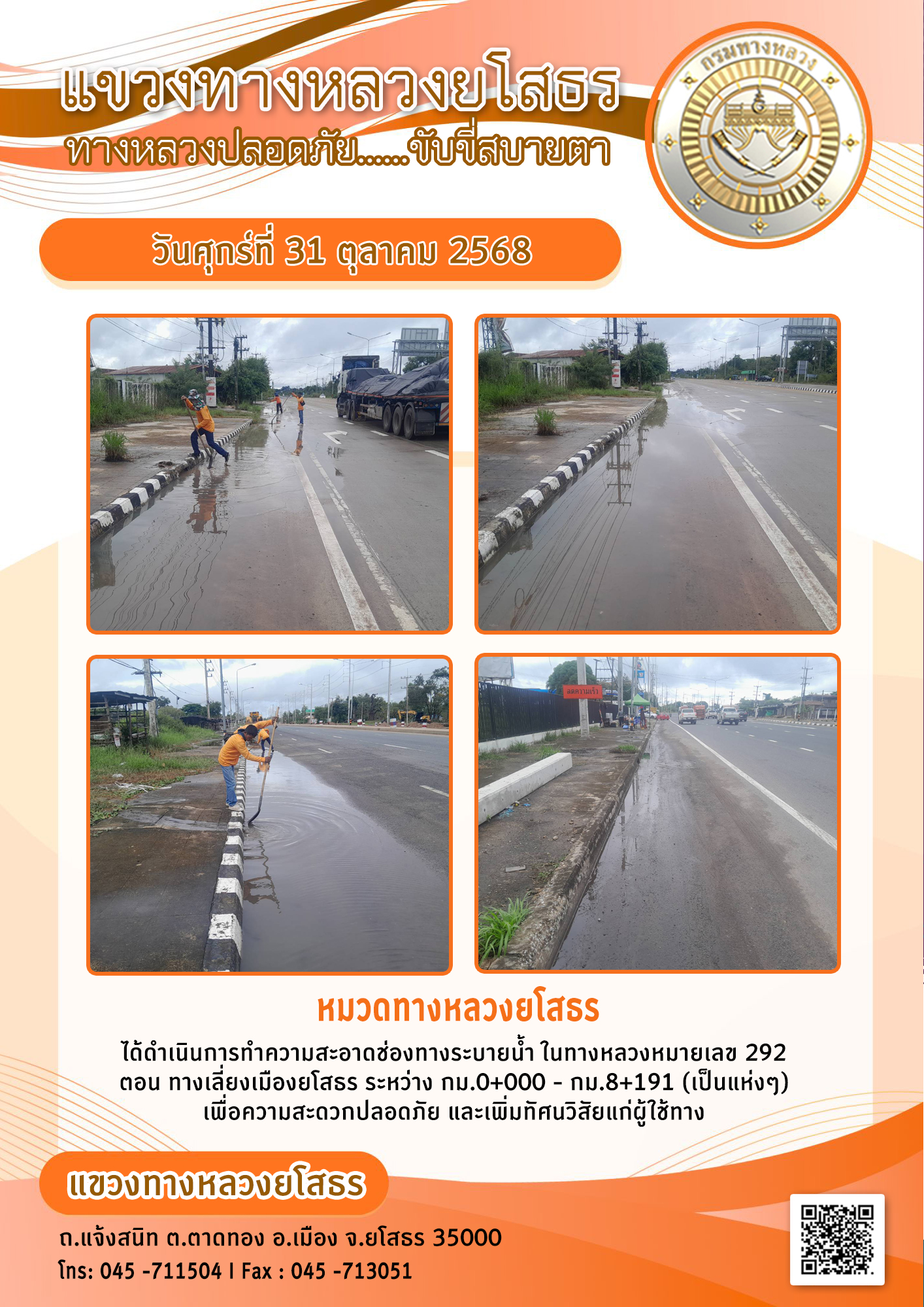 วันศุกร์ที่ 31 ตุลาคม 2568 หมวดทางหลวงยโสธร ได้ดำเนินการทำความสะอาดช่องทางระบายน้ำ ในทางหลวงหมายเลข 292 ตอน ทางเลี่ยงเมืองยโสธร ระหว่าง กม.0+000 - กม.8+191 (เป็นแห่งๆ) เพื่อความสะดวกปลอดภัย และเพิ่มทัศนวิสัยแก่ผู้ใช้ทาง