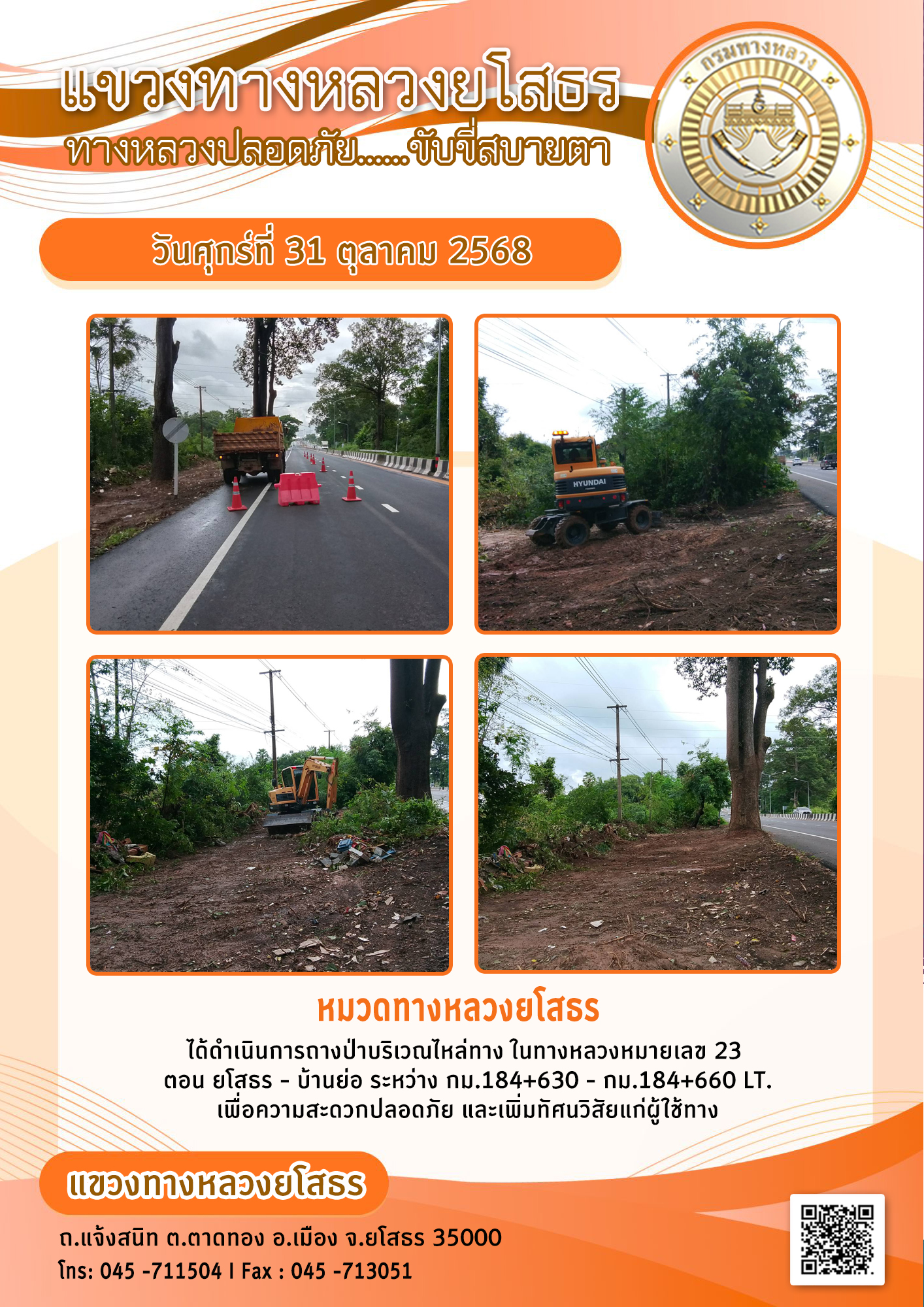 วันศุกร์ที่ 31 ตุลาคม 2568 หมวดทางหลวงยโสธร ได้ดำเนินการถางป่าบริเวณไหล่ทาง ในทางหลวงหมายเลข 23 ตอน ยโสธร - บ้านย่อ ระหว่าง กม.184+630 - กม.184+660 LT. เพื่อความสะดวกปลอดภัย และเพิ่มทัศนวิสัยแก่ผู้ใช้ทาง