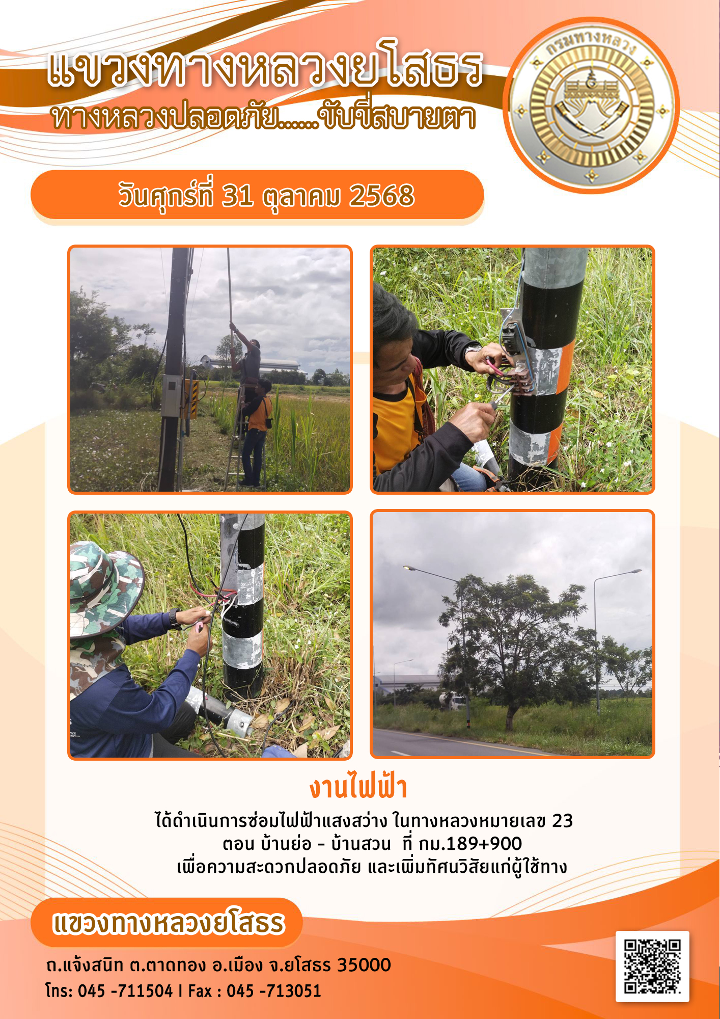 วันศุกร์ที่ 31 ตุลาคม 2568 งานไฟฟ้า ได้ดำเนินการซ่อมไฟฟ้าแสงสว่าง ในทางหลวงหมายเลข 23 ตอน บ้านย่อ - บ้านสวน ที่ กม.189+900 เพื่อความสะดวกปลอดภัย และเพิ่มทัศนวิสัยแก่ผู้ใช้ทาง