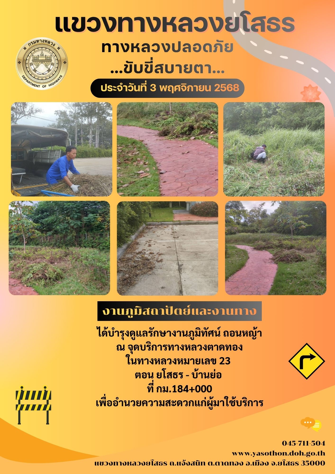 วันที่ 3 พฤศจิกายน 2568 งานภูมิสถาปัตย์และงานทาง ได้บำรุงดูแลรักษางานภูมิทัศน์ ถอนหญ้า ณ จุดบริการทางหลวงตาดทอง ในทางหลวงหมายเลข 23 ตอน ยโสธร - บ้านย่อ ที่ กม.184+000 เพื่ออำนวยความสะดวกแก่ผู้มาใช้บริการ