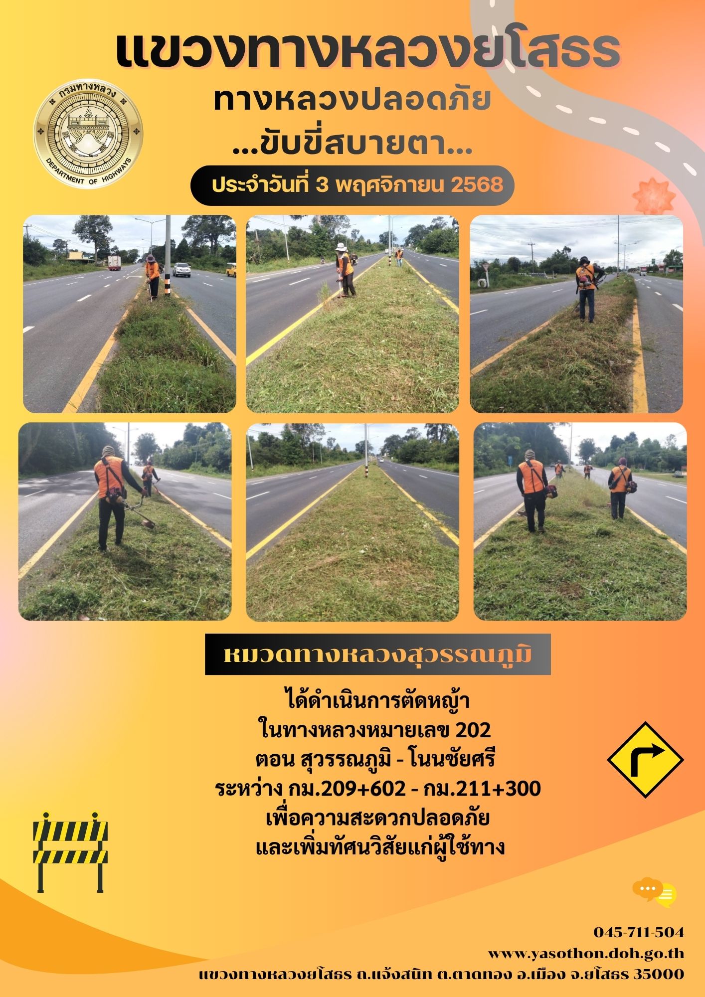 - [10:21] ทั่วไป วันอังคารที่ 31 มีนาคม 2569 งานอำนวยความปลอดภัย ได้ดำเนินการตัดหญ้า ทำความสะอาดภายในบริเวณแขวงทางหลวงยโสธร