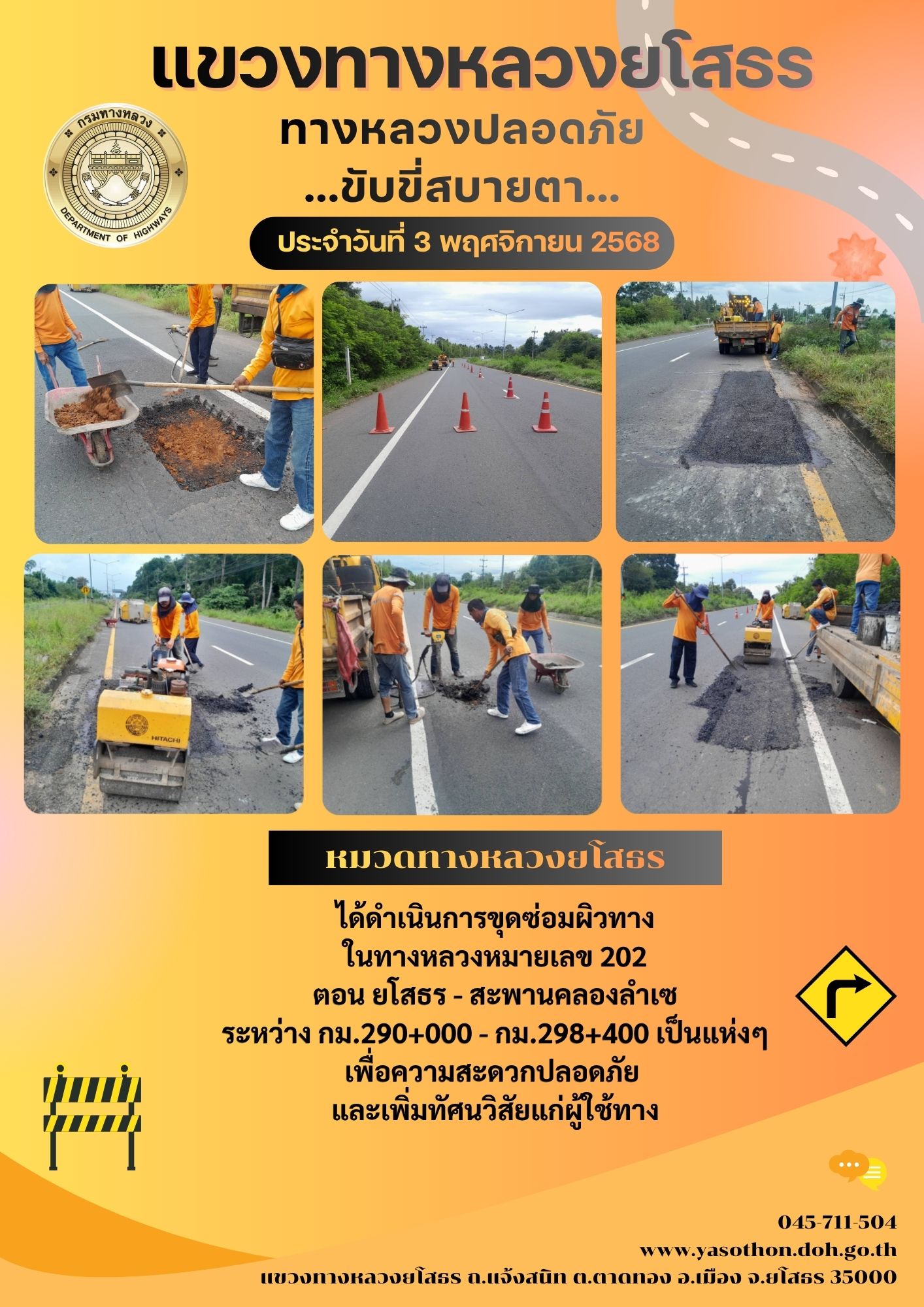 วันที่ 3 พฤศจิกายน 2568 หมวดทางหลวงยโสธร ได้ดำเนินการขุดซ่อมผิวทาง ในทางหลวงหมายเลข 202 ตอน ยโสธร - สะพานคลองลำเซ ระหว่าง กม.290+000 - กม.298+400 เป็นแห่งๆ เพื่อความสะดวกปลอดภัย และเพิ่มทัศนวิสัยแก่ผู้ใช้ทาง