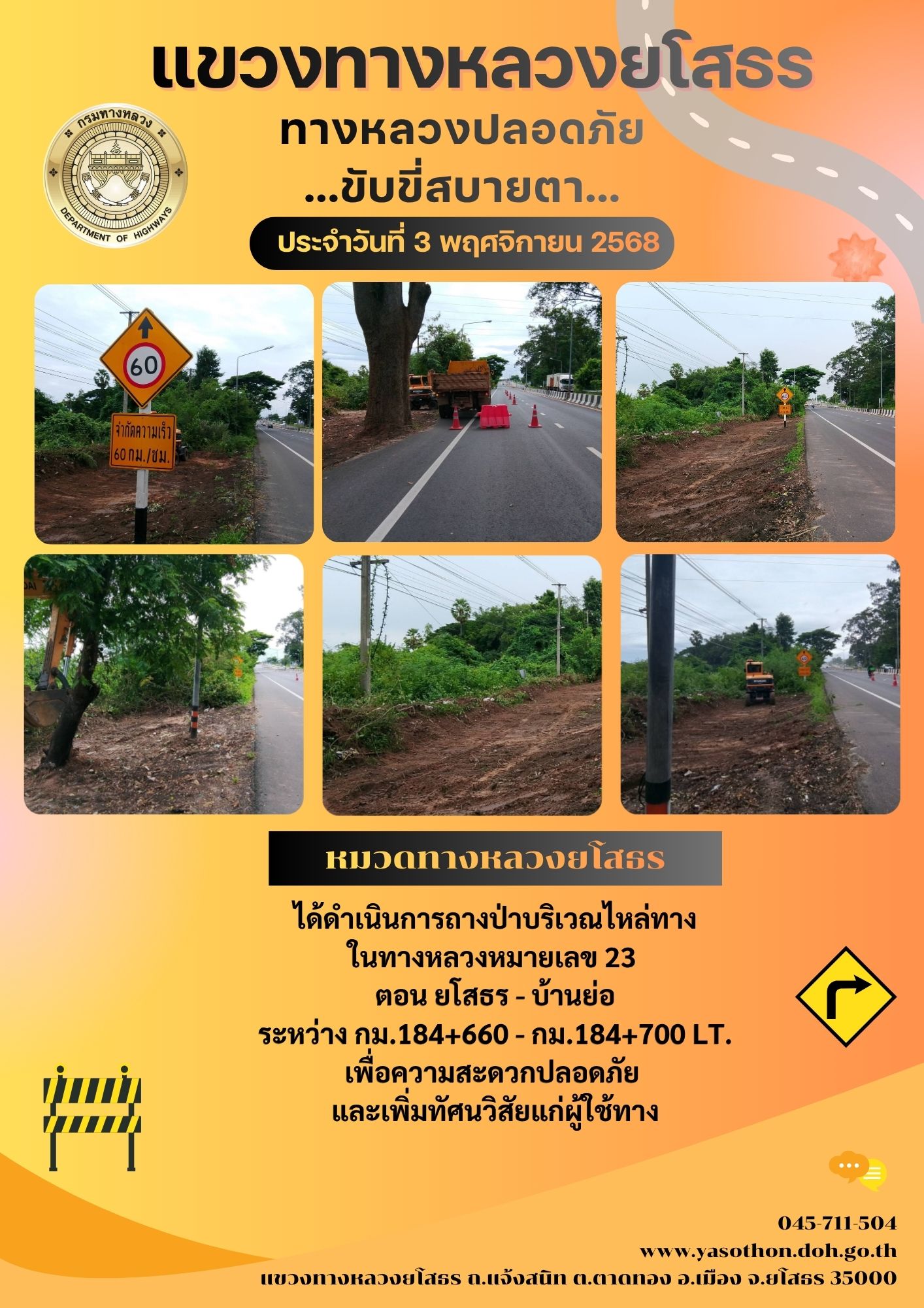 วันที่ 3 พฤศจิกายน 2568 หมวดทางหลวงยโสธร ได้ดำเนินการถางป่าบริเวณไหล่ทาง ในทางหลวงหมายเลข 23 ตอน ยโสธร - บ้านย่อ ระหว่าง กม.184+660 - กม.184+700 LT. เพื่อความสะดวกปลอดภัย และเพิ่มทัศนวิสัยแก่ผู้ใช้ทาง
