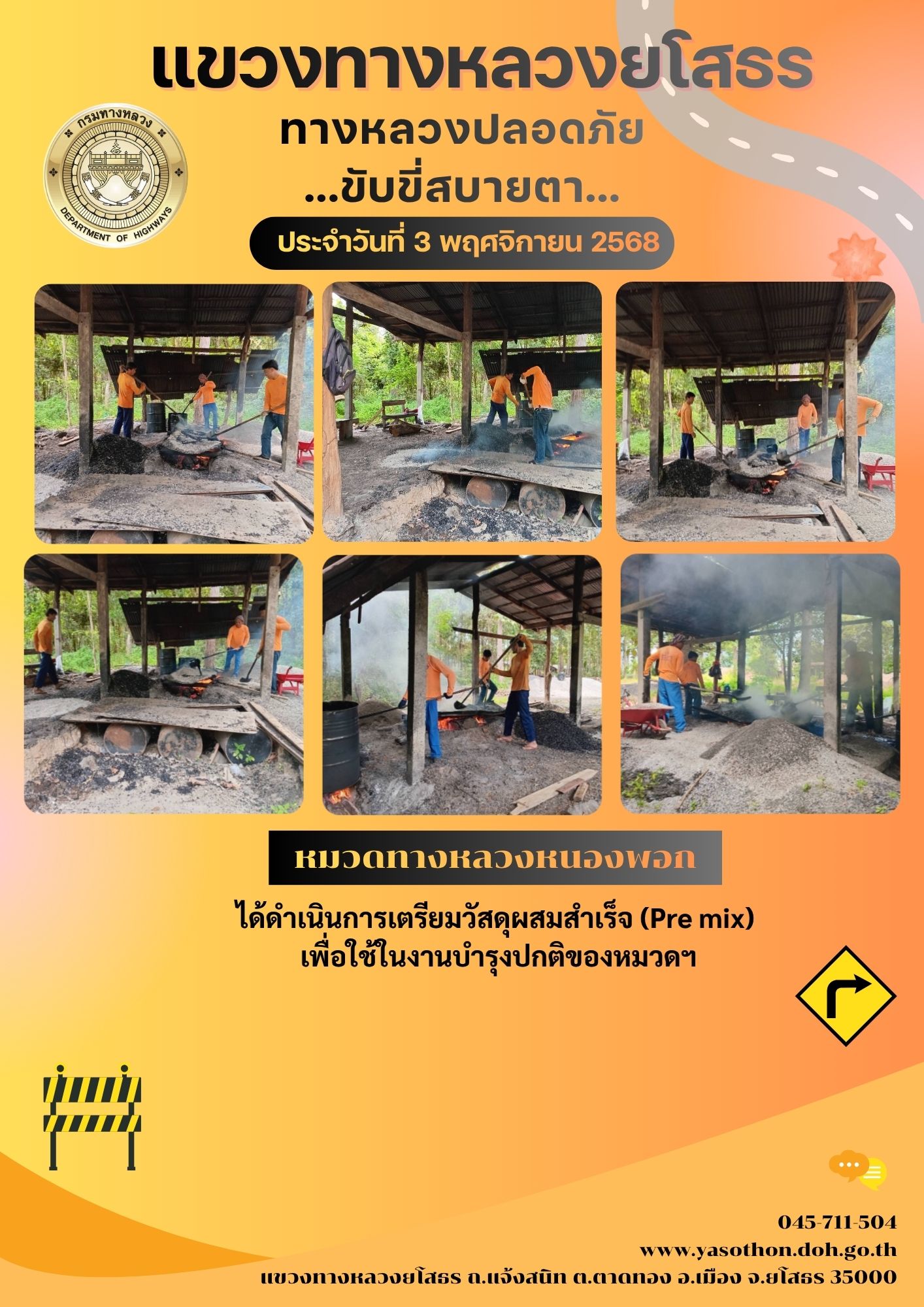 วันที่ 3 พฤศจิกายน 2568 หมวดทางหลวงหนองพอก ได้ดำเนินการเตรียมวัสดุผสมสำเร็จ (Pre mix) เพื่อใช้ในงานบำรุงปกติของหมวดฯ