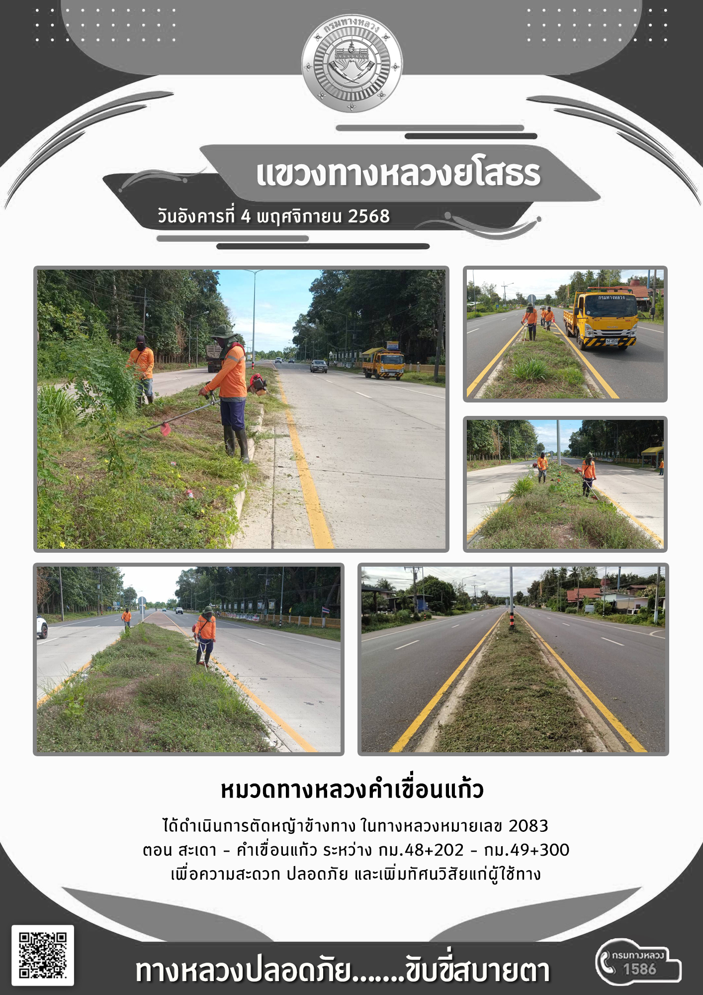 วันอังคารที่ 4 พฤศจิกายน 2568 หมวดทางหลวงคำเขื่อนแก้ว ได้ดำเนินการตัดหญ้าข้างทาง ในทางหลวงหมายเลข 2083 ตอน สะเดา - คำเขื่อนแก้ว ระหว่าง กม.48+202 - กม.49+300 เพื่อความสะดวก ปลอดภัย และเพิ่มทัศนวิสัยแก่ผู้ใช้ทาง