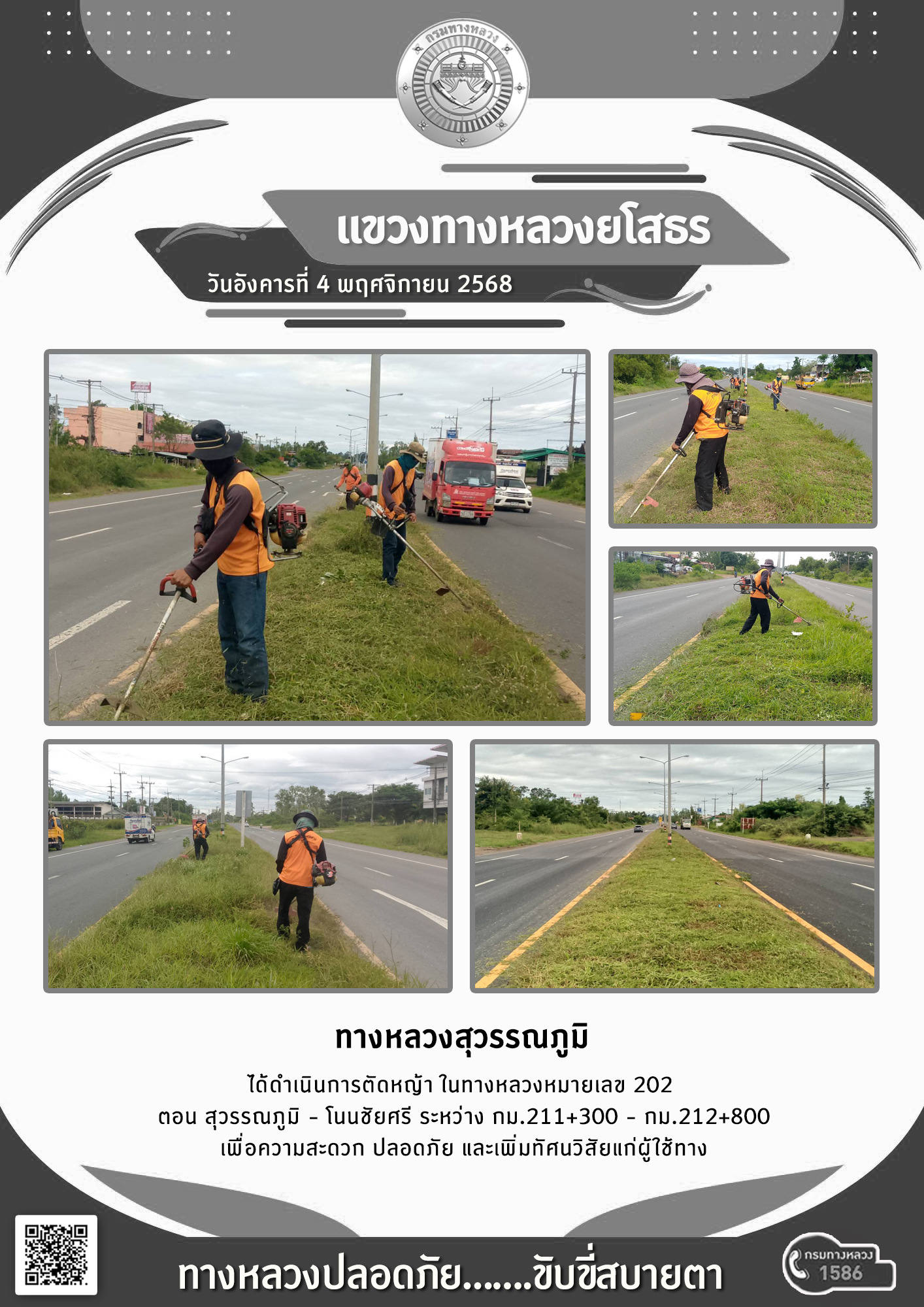 วันอังคารที่ 4 พฤศจิกายน 2568 หมวดทางหลวงสุวรรณภูมิ ได้ดำเนินการตัดหญ้า ในทางหลวงหมายเลข 202 ตอน สุวรรณภูมิ - โนนชัยศรี ระหว่าง กม.211+300 - กม.212+800 เพื่อความสะดวก ปลอดภัย และเพิ่มทัศนวิสัยแก่ผู้ใช้ทาง