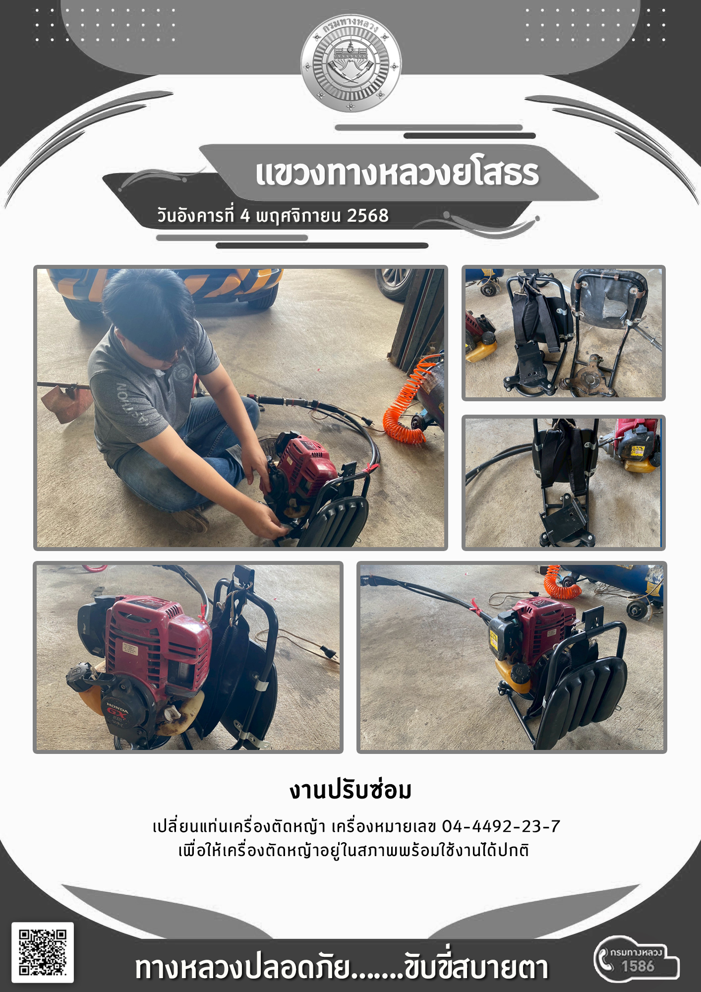 วันอังคารที่ 4 พฤศจิกายน 2568 งานปรับซ่อม เปลี่ยนแท่นเครื่องตัดหญ้า เครื่องหมายเลข 04-4492-23-7 เพื่อให้เครื่องตัดหญ้าอยู่ในสภาพพร้อมใช้งานได้ปกติ