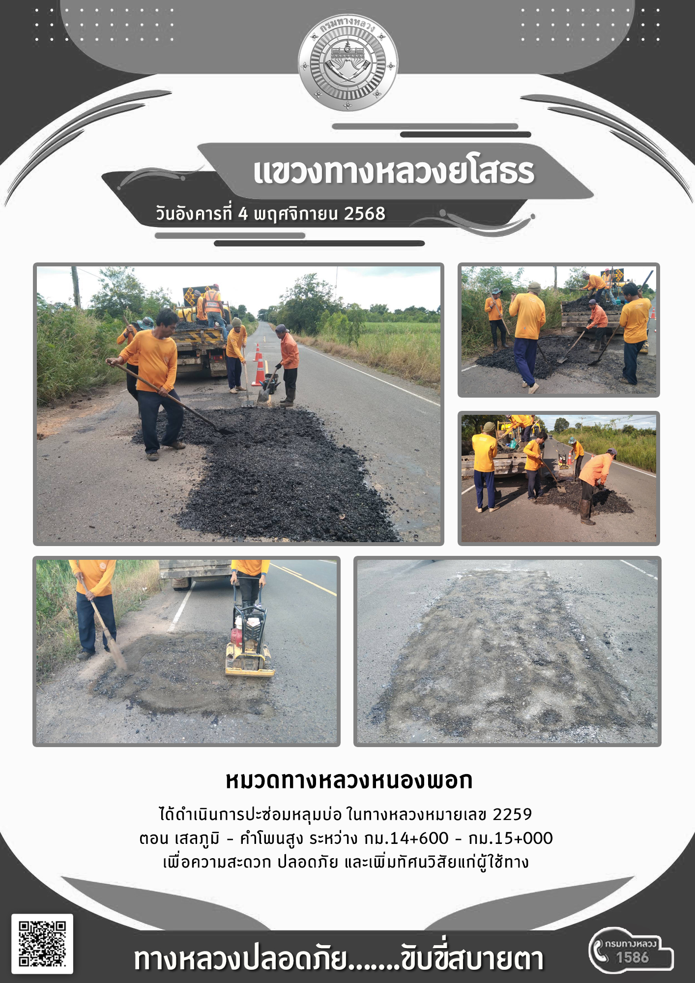 วันอังคารที่ 4 พฤศจิกายน 2568 หมวดทางหลวงหนองพอก ได้ดำเนินการปะซ่อมหลุมบ่อ ในทางหลวงหมายเลข 2259 ตอน เสลภูมิ - คำโพนสูง ระหว่าง กม.14+600 - กม.15+000 เพื่อความสะดวก ปลอดภัย และเพิ่มทัศนวิสัยแก่ผู้ใช้ทาง