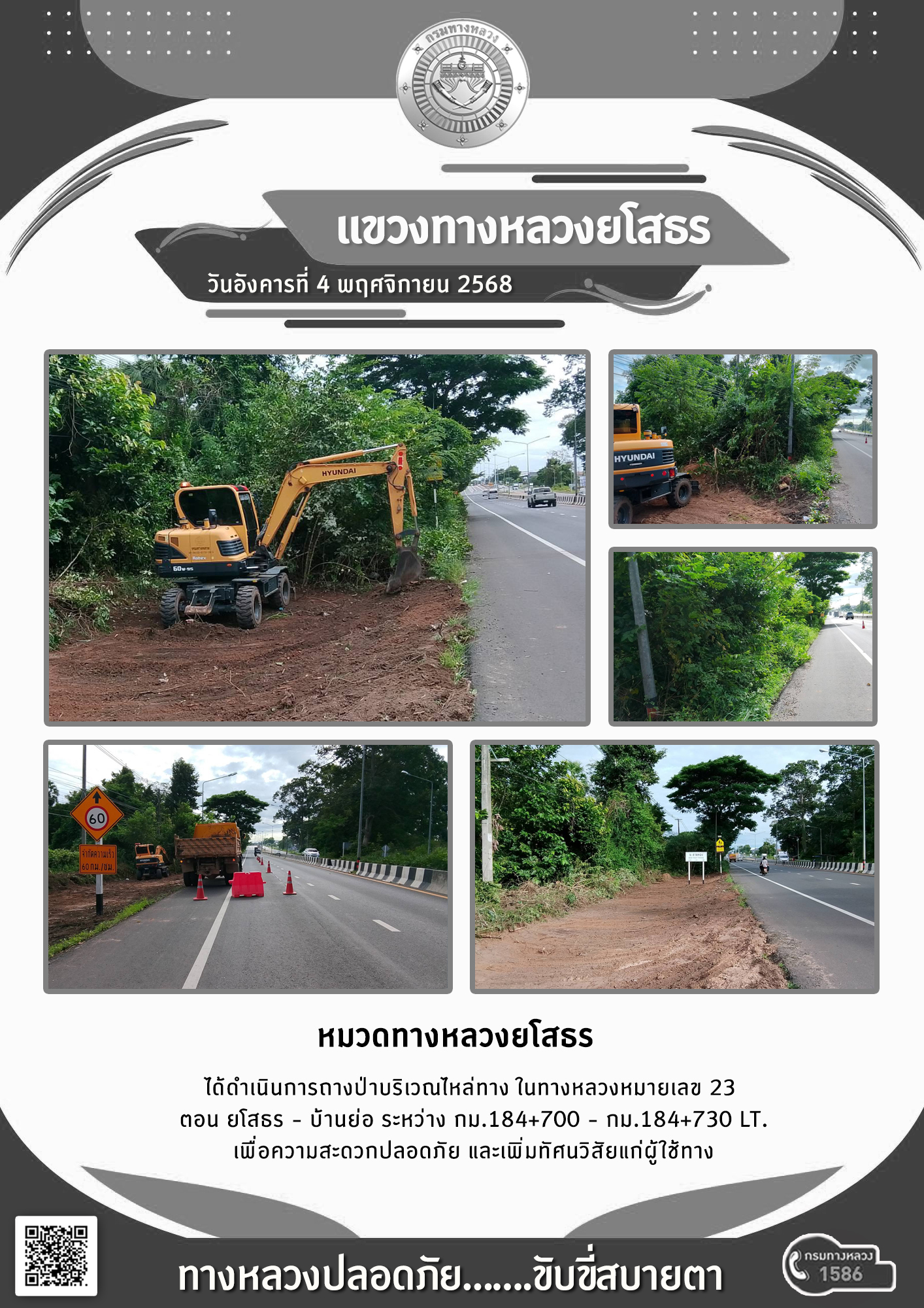 วันอังคารที่ 4 พฤศจิกายน 2568 หมวดทางหลวงยโสธร ได้ดำเนินการถางป่าบริเวณไหล่ทาง ในทางหลวงหมายเลข 23 ตอน ยโสธร - บ้านย่อ ระหว่าง กม.184+700 - กม.184+730 LT. เพื่อความสะดวกปลอดภัย และเพิ่มทัศนวิสัยแก่ผู้ใช้ทาง