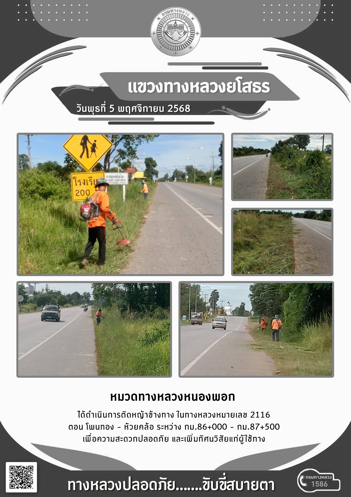 วันพุธที่ 5 พฤศจิกายน 2568 หมวดทางหลวงหนองพอก ได้ดำเนินการตัดหญ้าข้างทาง ในทางหลวงหมายเลข 2116 ตอน โพนทอง - ห้วยคล้อ ระหว่าง กม.86+000 - กม.87+500 เพื่อความสะดวกปลอดภัย และเพิ่มทัศนวิสัยแก่ผู้ใช้ทาง